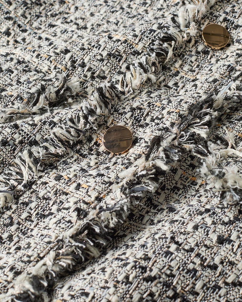 リッチなファンシーツイード素材ラメ糸、スラブ糸、テープヤーンなど、さまざまな意匠糸とカラーヤーンを組み合わせて織り上げたファンシーツイードを使用。多色使いの華やかさはありながらモノトーンベースなので、どんなアイテムを合わせてもシックにまとまります。