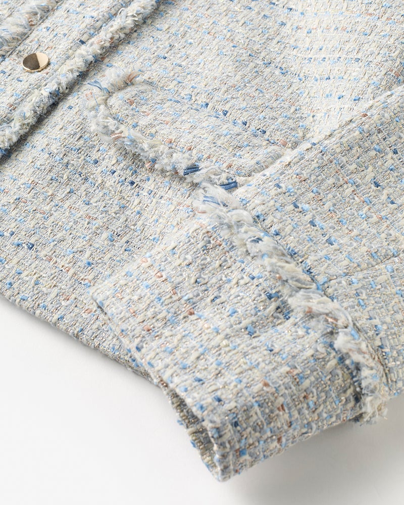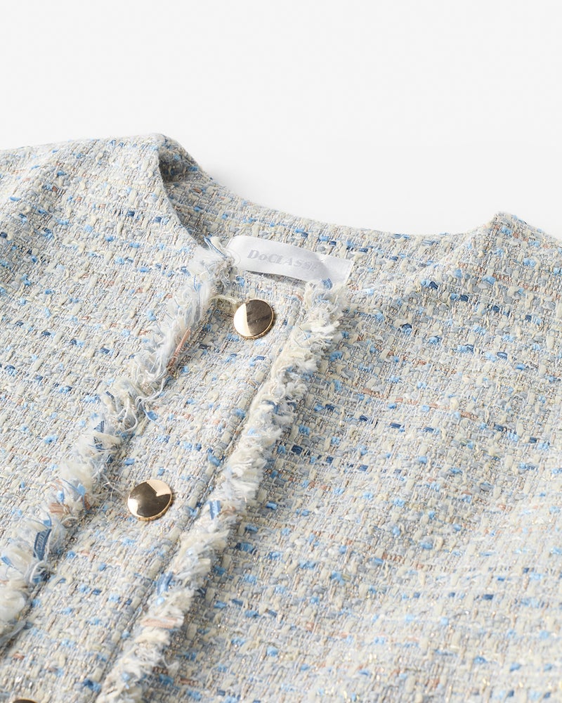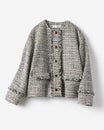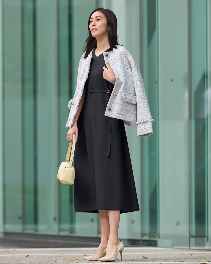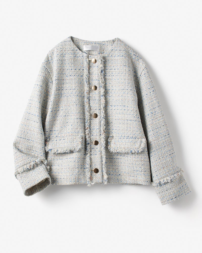 さまざまな意匠糸を織り上げたファンシーツイードのノーカラージャケット。ツイードならではの品格はそのままに、ほどよいオーバーサイズとフリンジディテールが抜け感を演出します。きれいめはもちろん、デニムやワイドパンツを合わせてカジュアルにも楽しめます。
