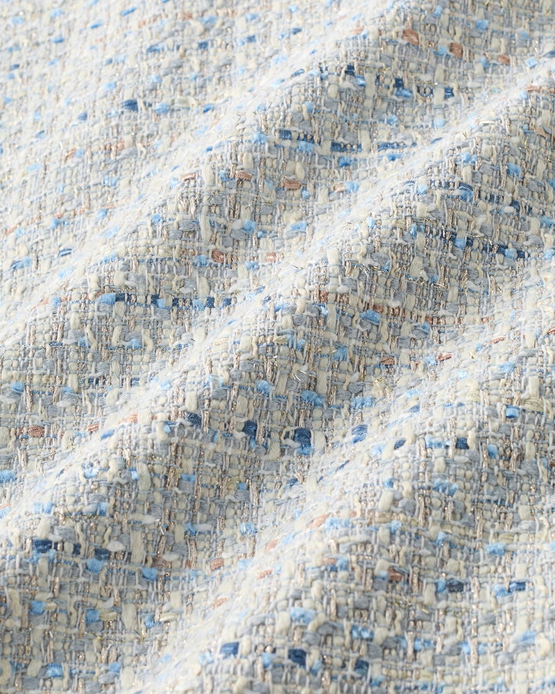 リッチなファンシーツイード素材ラメ糸、スラブ糸、テープヤーンなど、さまざまな意匠糸とカラーヤーンを組み合わせて織り上げたファンシーツイードを使用。多色使いの華やかさはありながらモノトーンベースなので、どんなアイテムを合わせてもシックにまとまります。