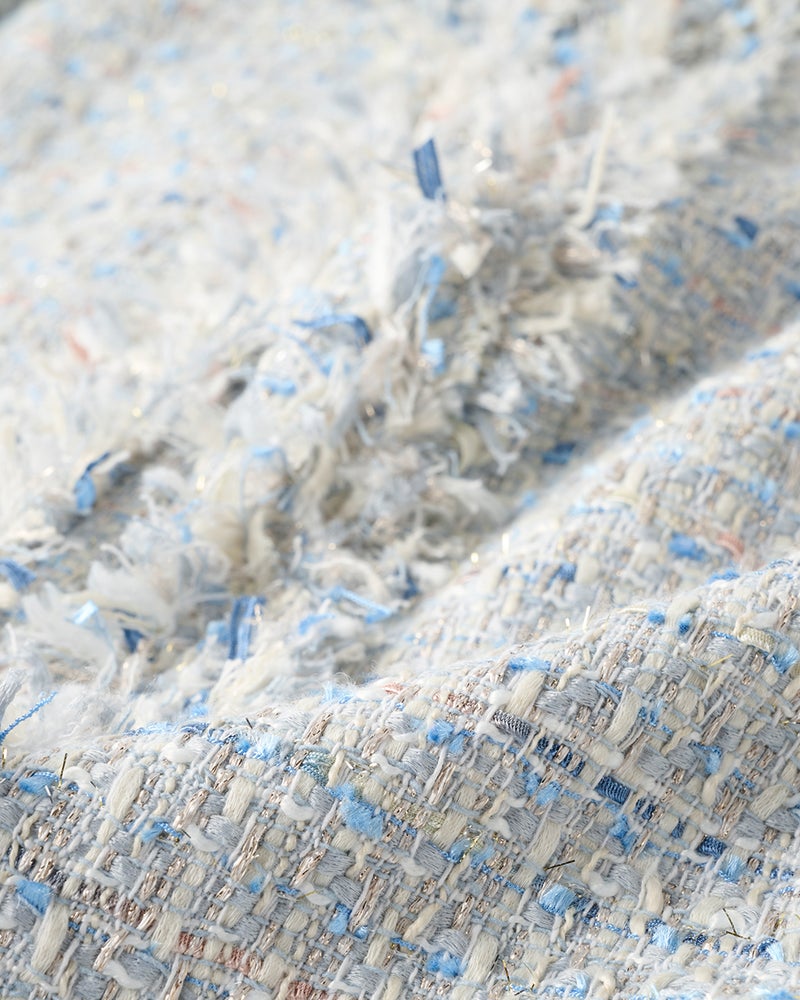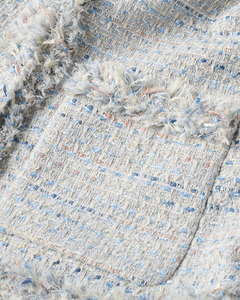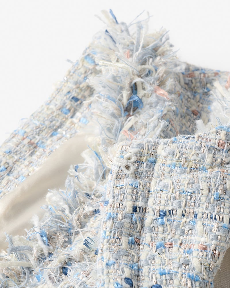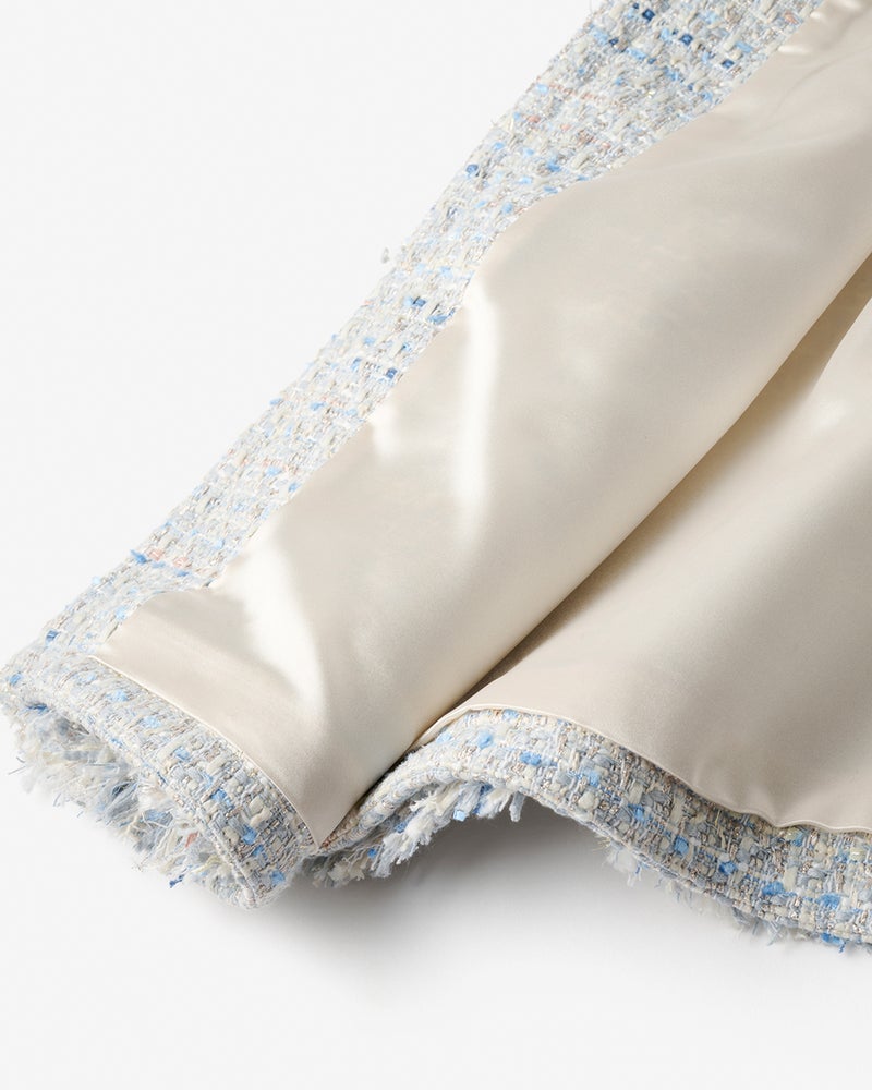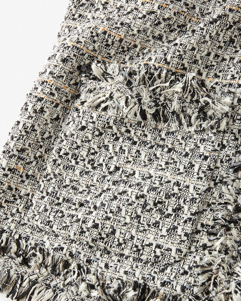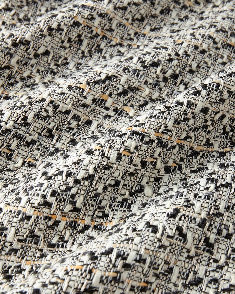 リッチなファンシーツイード素材ラメ糸、スラブ糸、テープヤーンなど、さまざまな意匠糸とカラーヤーンを組み合わせて織り上げたファンシーツイードを使用。多色使いの華やかさはありながらモノトーンベースなので、どんなアイテムを合わせてもシックにまとまります。