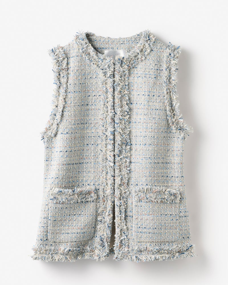 さまざまな意匠糸を織り上げたファンシーツイードのミドル丈ジレ。素材が華やかさを担保するから、カジュアル合わせでも上品にまとまります。クラシカルなクルーネックに、動きのあるフリンジが抜け感をプラス。バランスのとりやすいミドル丈は、どんなボトムとも好相性です。