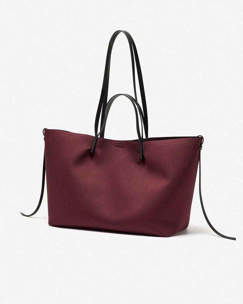 広い底マチでしっかり自立し、両側のリボンを結べば台形フォルムに変化。荷物の量やコーデに応じて形を変え、バランスを調整できます。