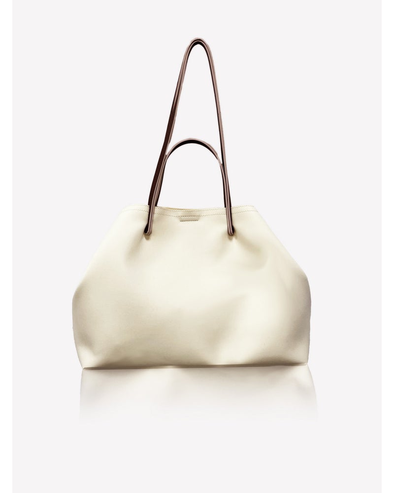 長短のハンドルをつけ、手持ちにも肩掛けにもなる仕様。手持ちの際には、長いハンドルを外側に下げて持つことでデザインポイントになります。