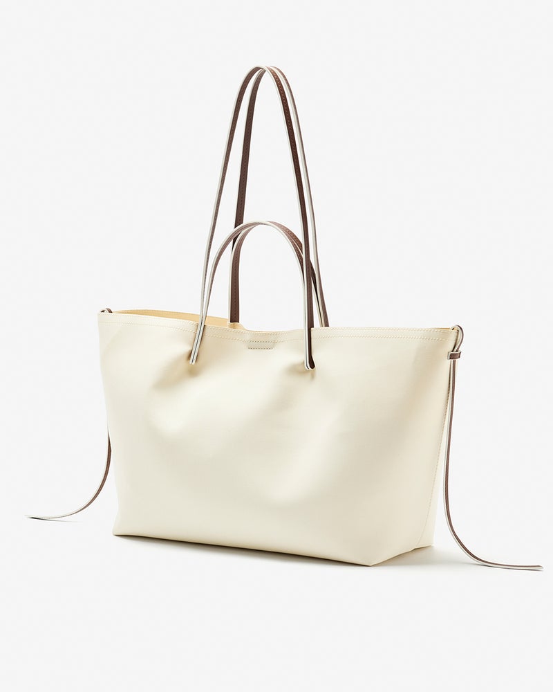 本体は、コットンにリヨセルを混紡したこなれ感のある上質生地を使用。細めの持ち手はレザー調にし、素材選びからデザインまで大人にふさわしいリッチ感にこだわりました。本体には汚れのつきにくい加工をしています。