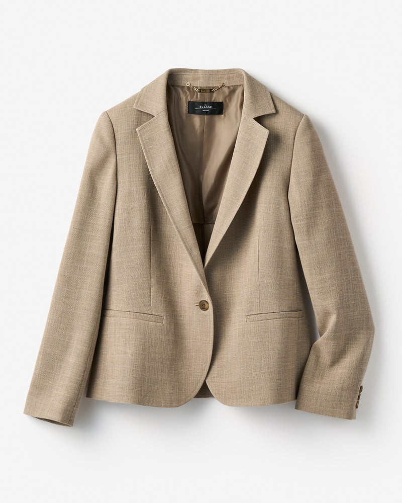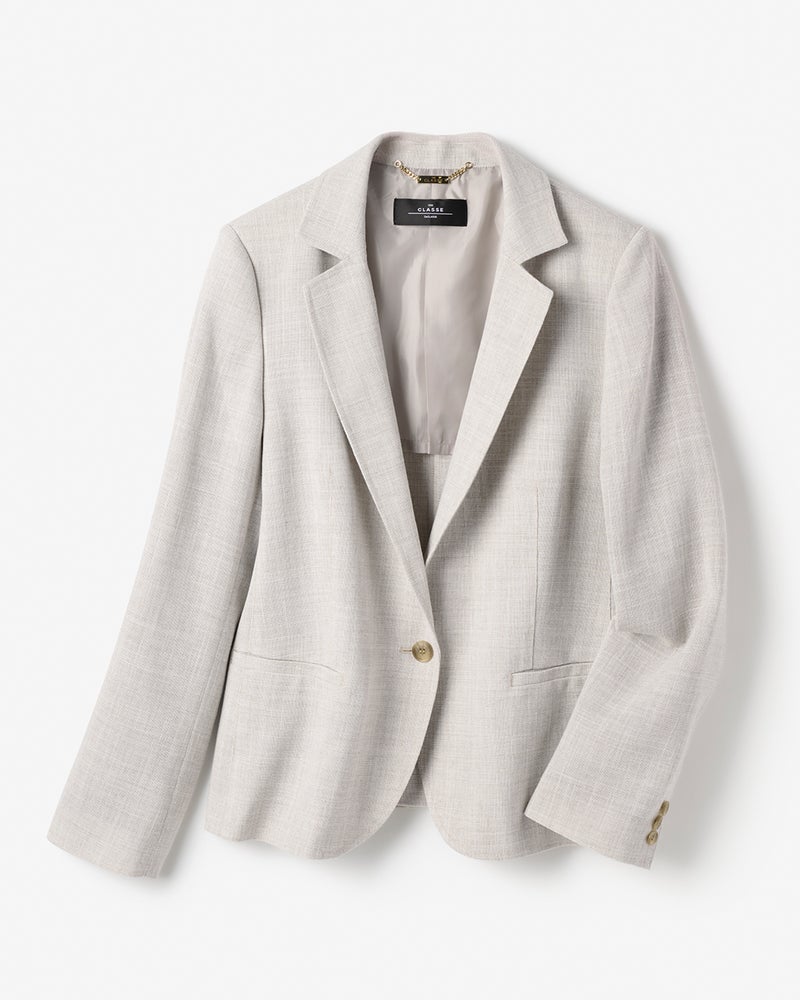 ワイドパンツやフレアスカートに合わせたいのがこのコンパクトジャケット。タイトじゃないのにすっきり見えるナチュラルシェイプシルエットをベースに、ボリュームボトムスがバランスよく着こなせるコンパクトな腰丈に設定。小柄な方にもおすすめの新しいテーラードの形です。もう、硬いスーツは必要ない。