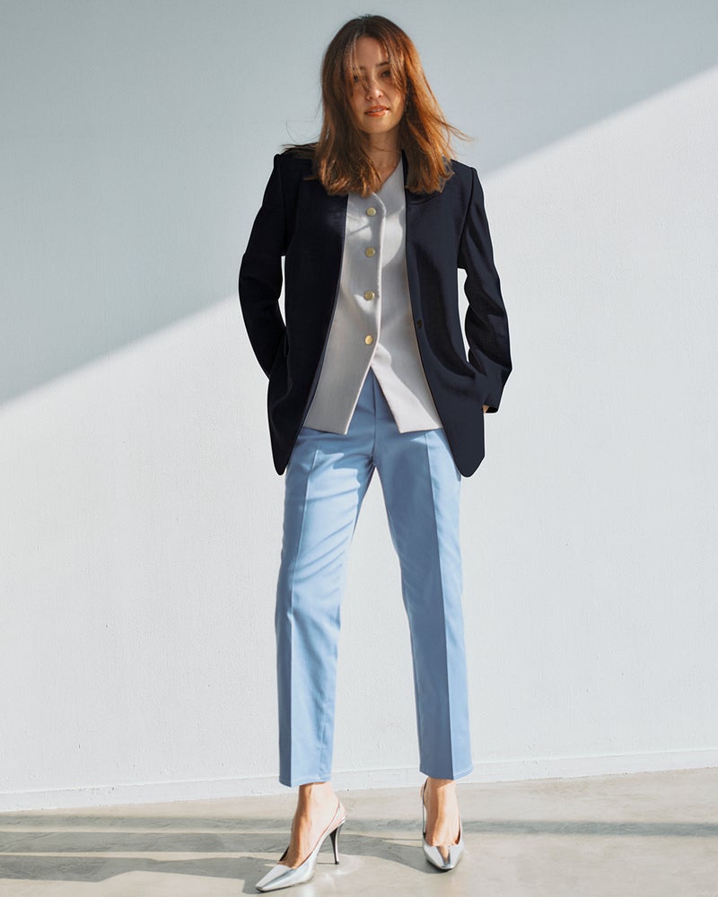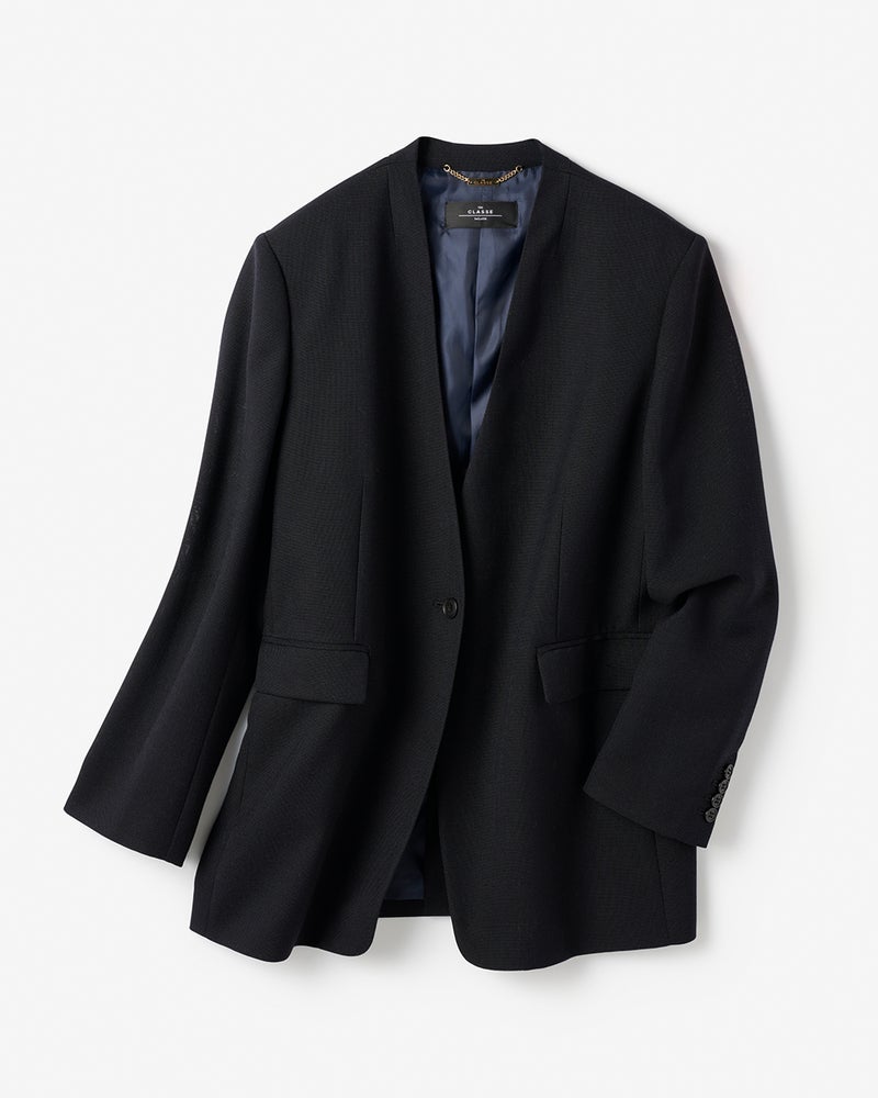 体を締め付けないゆったりフォルムのノーカラーは、バサッと羽織って大人が絵になる1着。衿後ろを少し立ち上げたネックデザインやボトムスを選ばない絶妙の丈感など、オンもオフもシーンレスに着こなせる美シルエットに仕立てました。
