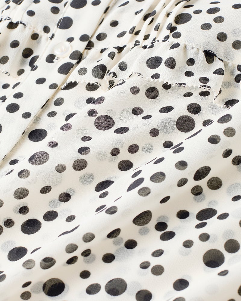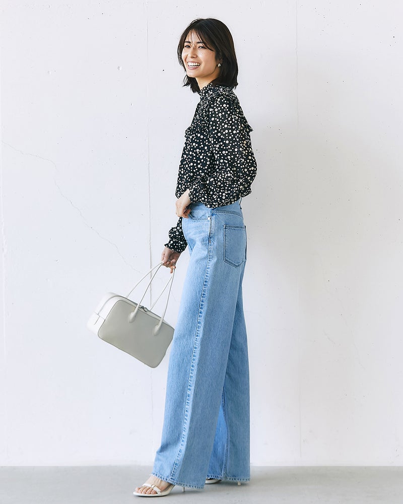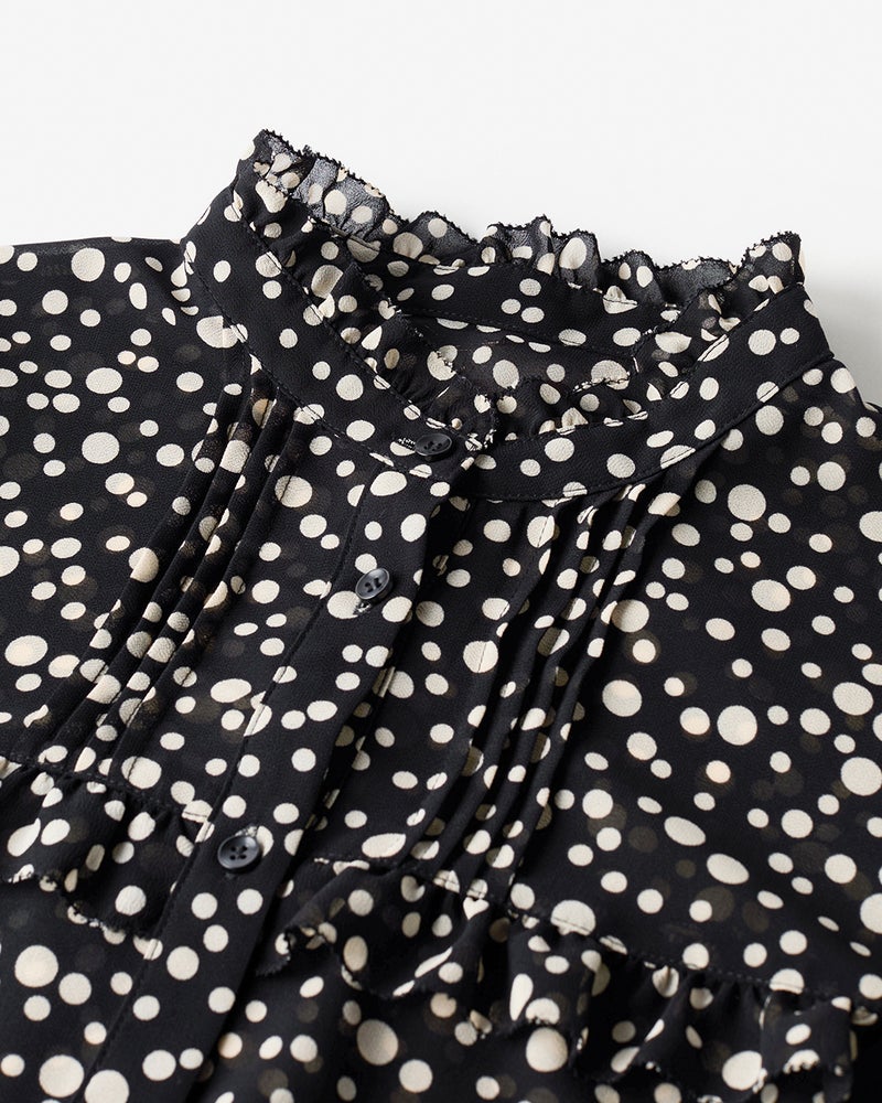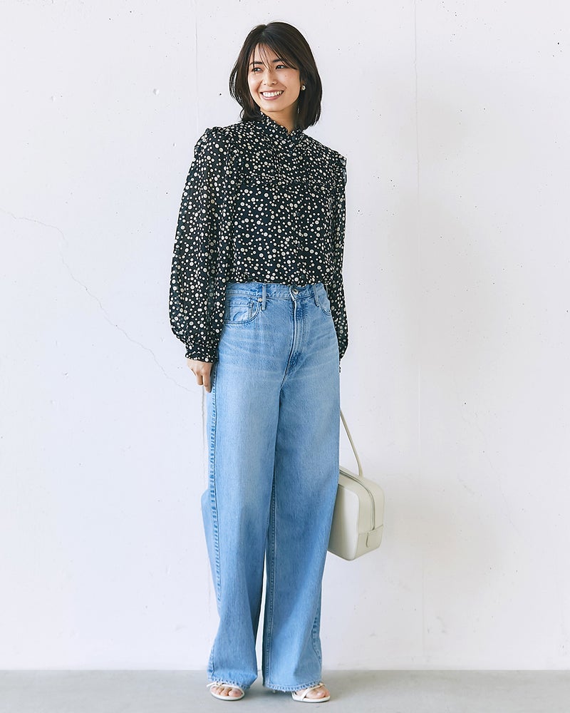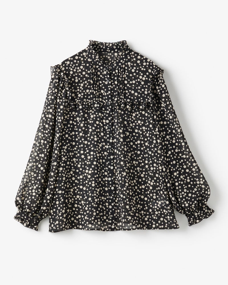 ヨーク部分のフリルとピンタックが懐かしくも新しい、ボザムデザインのブラウス。透け感のあるシフォン素材は、大人のフェミニンスタイルにぴったり。デニムなどのカジュアルボトムスとも好相性です。ランダムなドット柄と無地から選べます。
