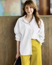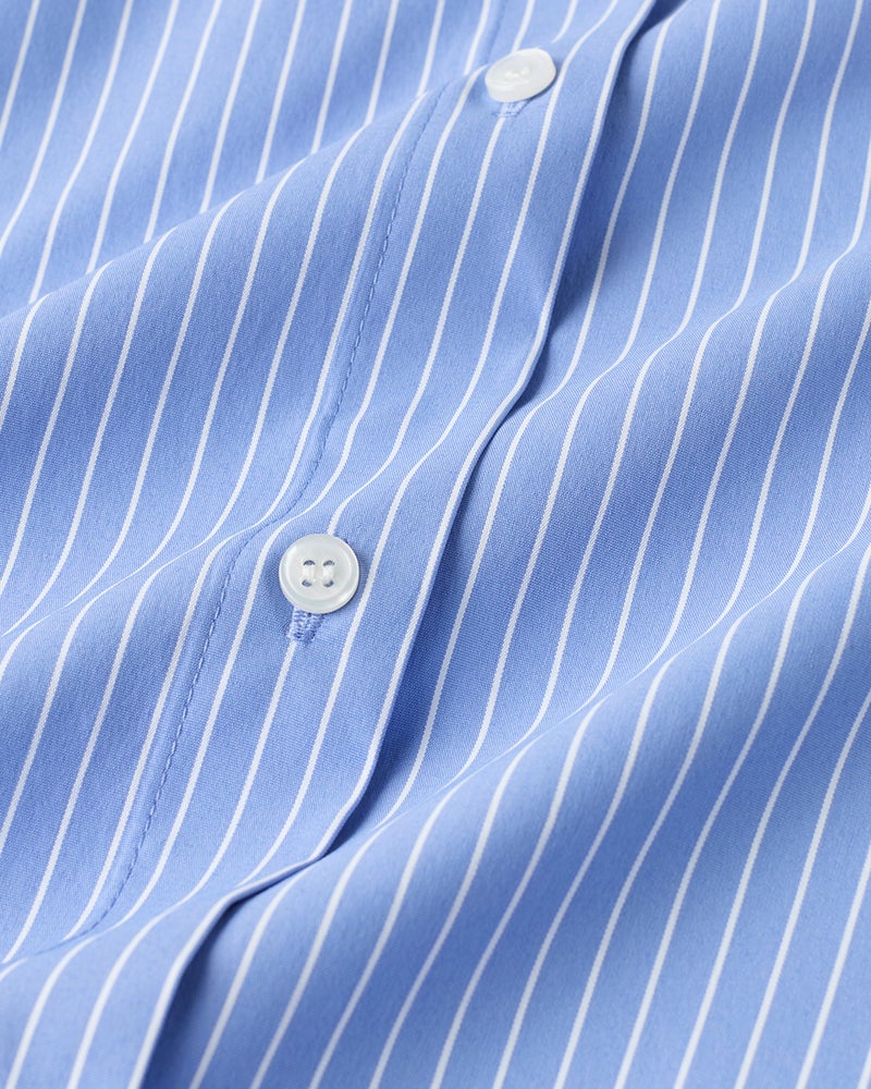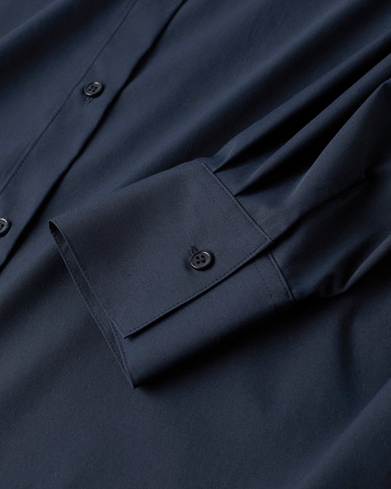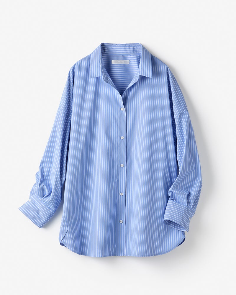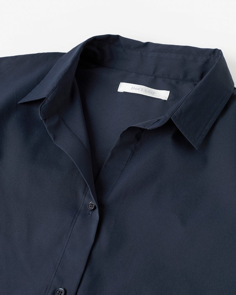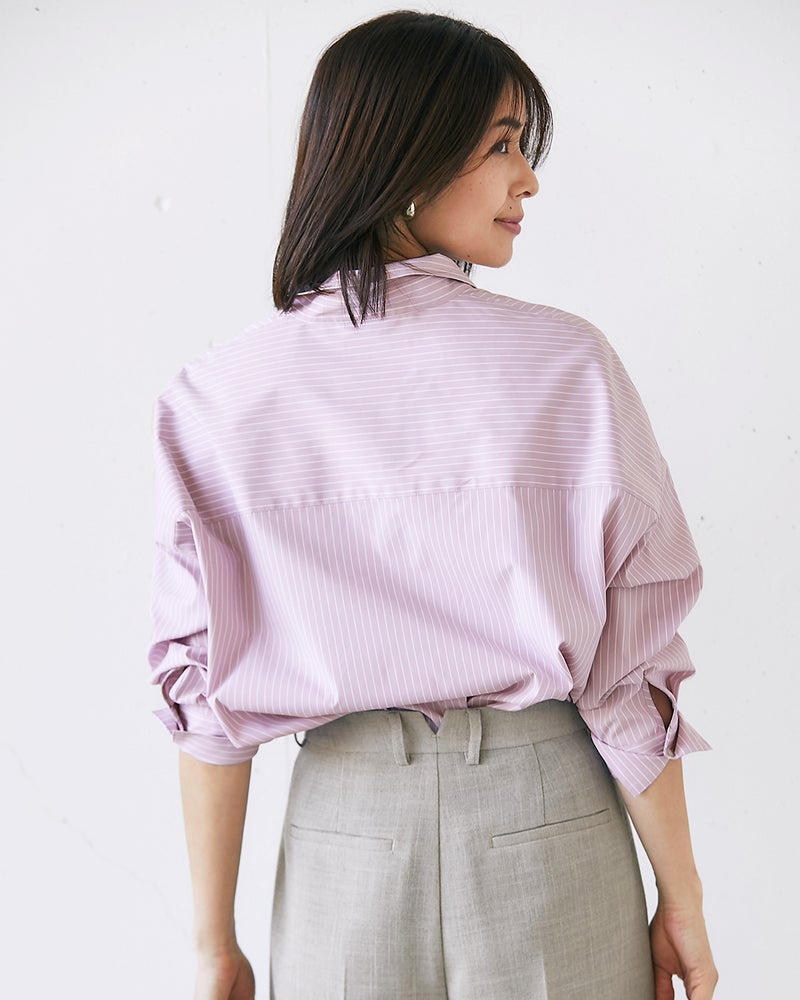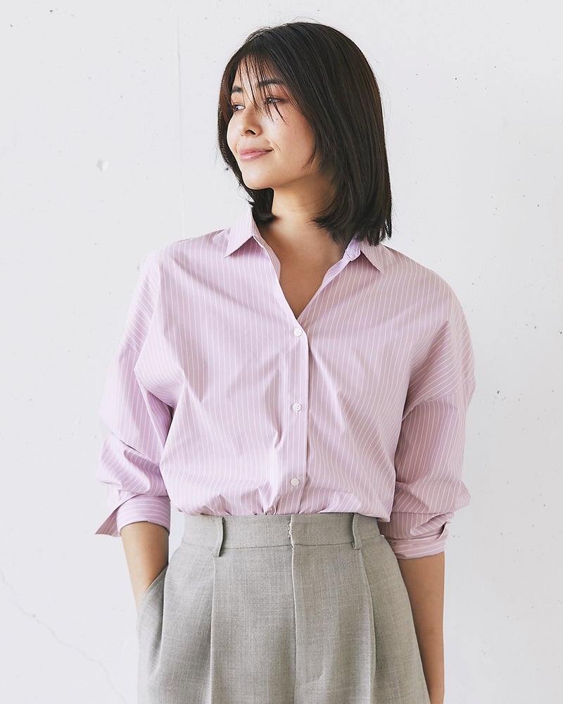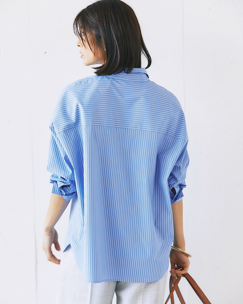 衿を抜いて着ると、こなれ感が出ておしゃれ。落ち感のあるショルダーや重ねスリットなど、ディテールにこだわった構築シャツ。サイドの切り替えをやや前寄りにすることで、すっきりとしたフォルムに仕上げました。紫外線カット、吸水速乾、イージーケア機能を備えた素材を採用。