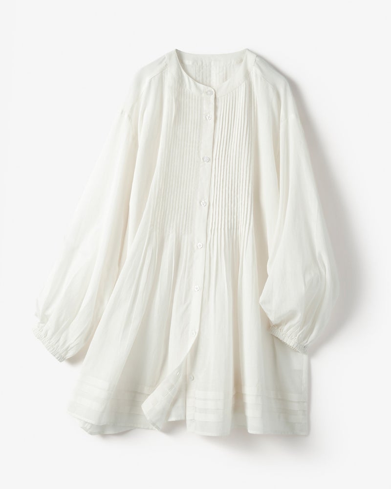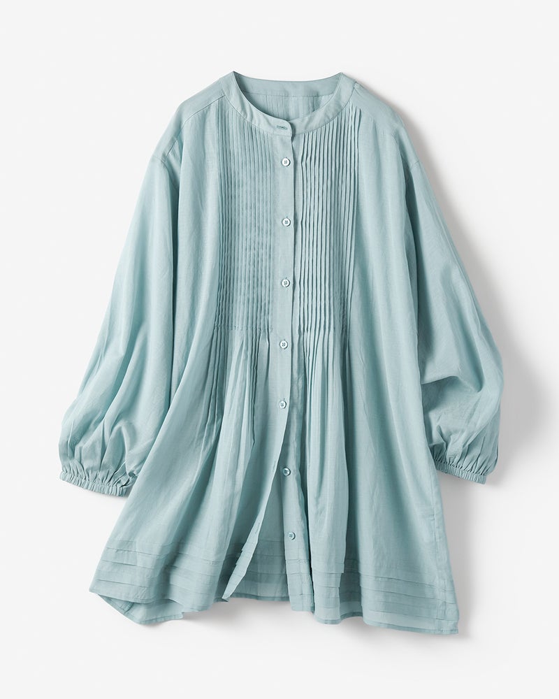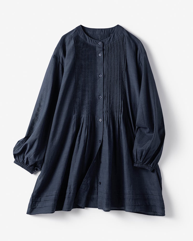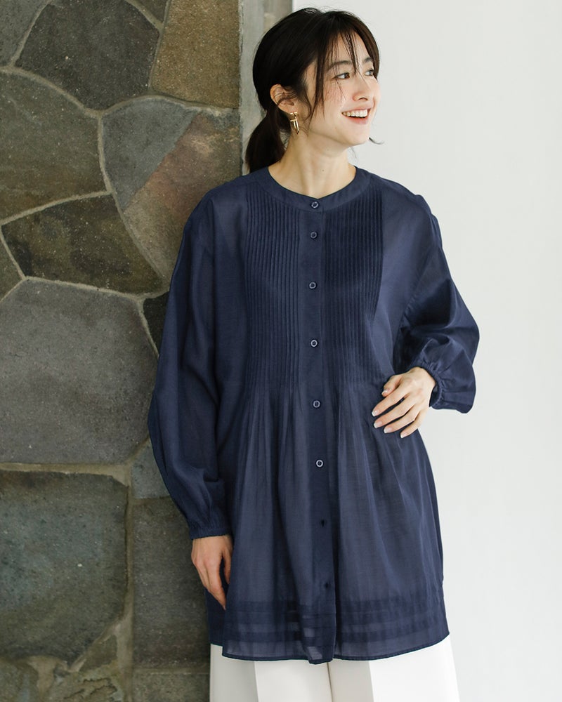 フロントの細いピンタックや繊細なギャザー、上品な透け感など、上質感へのこだわりが光るおつくり。首元をすっきり見せるバンドカラーはボタンを外して羽織にも。