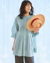 強撚糸を織り上げてレーヨンをブレンドした、柔らかな肌ざわりのコットン混ボイル素材を使用。胸元の細ピンタックやふんわりと入ったギャザーが、女らしさを演出しながら体型をカバーしてくれます。透けすぎないシアー感が上品で、夏まで涼しげにお召しいただけます。