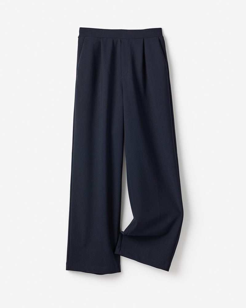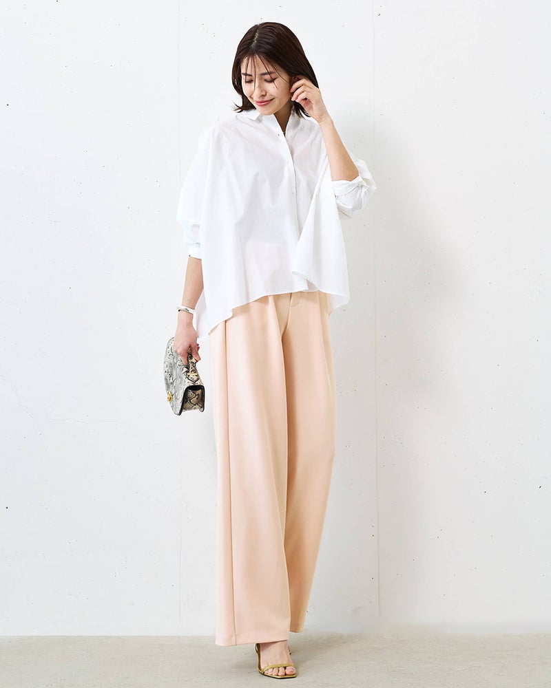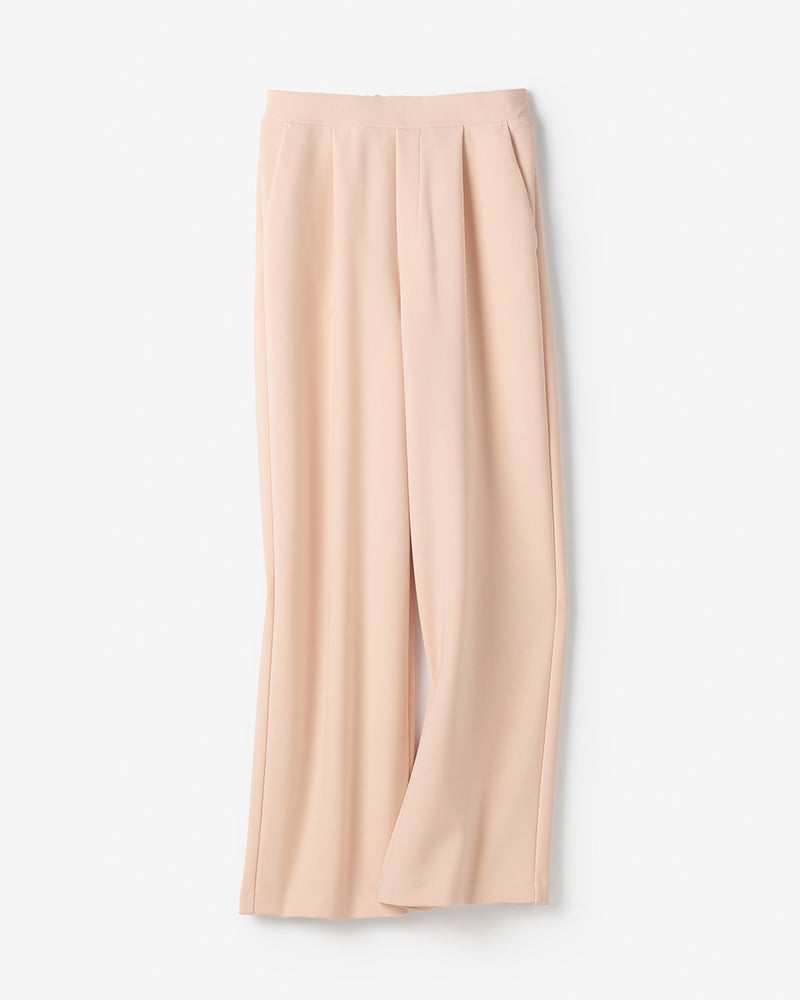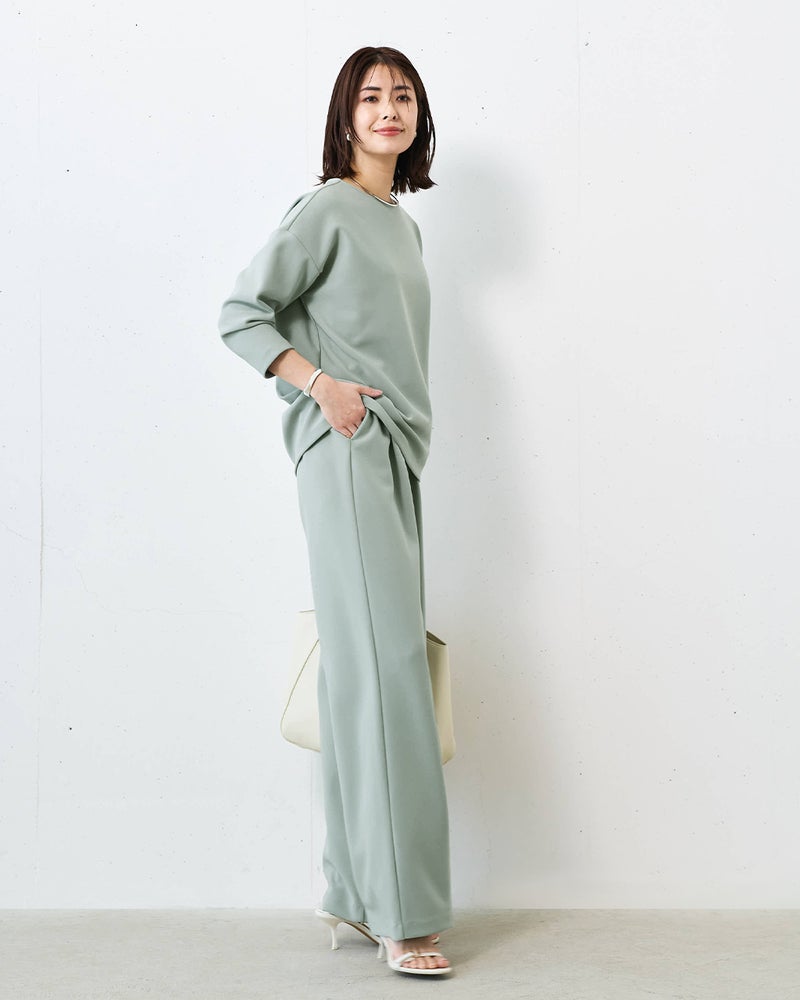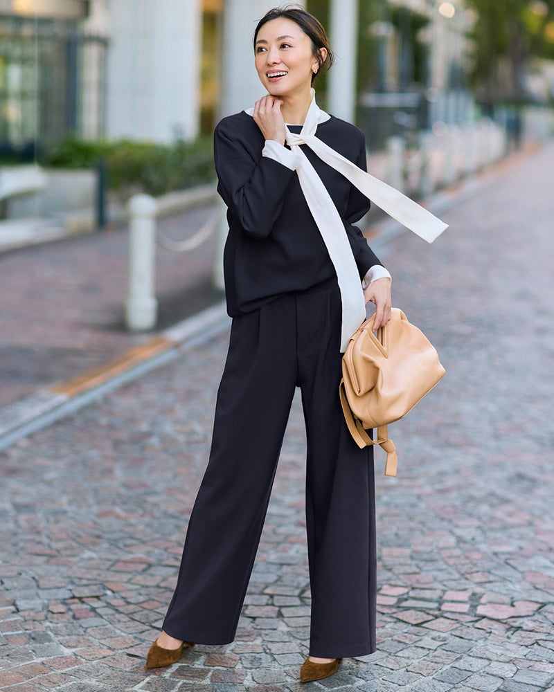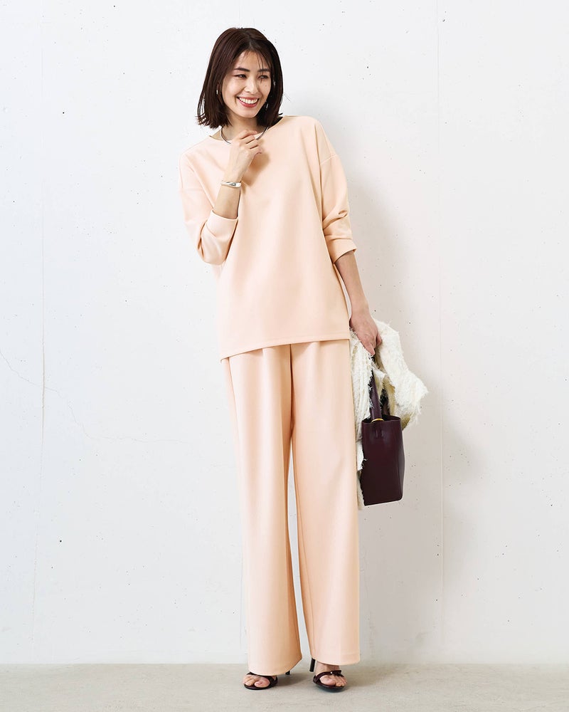 タックから落ちるドレープが、大人のレッグラインをきれいに見せる計算されたデザイン。なめらかな落ち感のあるカットソーのジョーゼット素材は、ビジネスやオケージョンもこなせる上質感。同素材のプルオーバーとのセットアップもおすすめ。こなれ見えしつつ、インテリジェンスも感じさせるたたずまいが完成します。