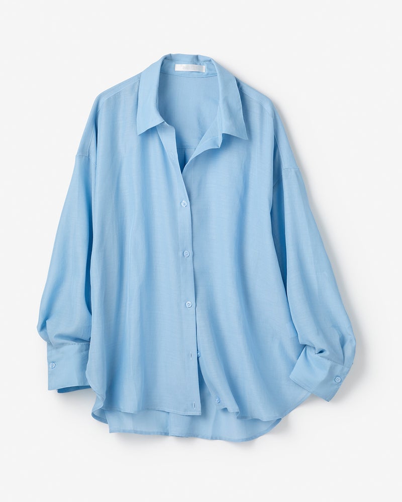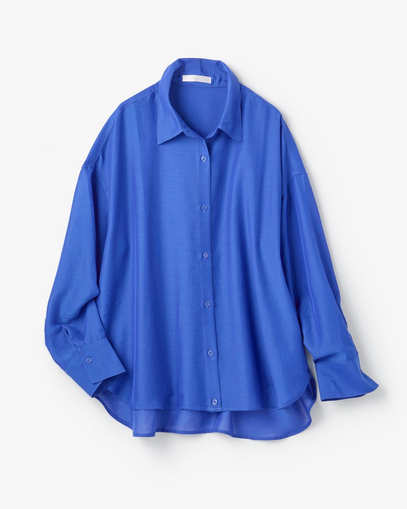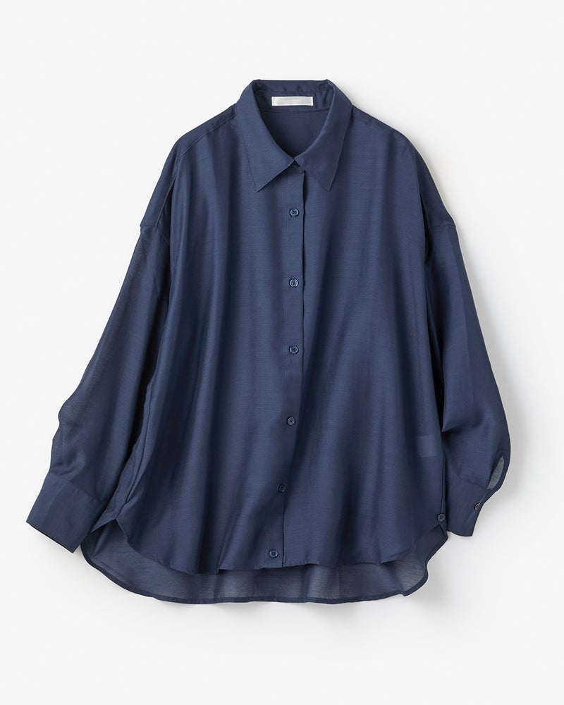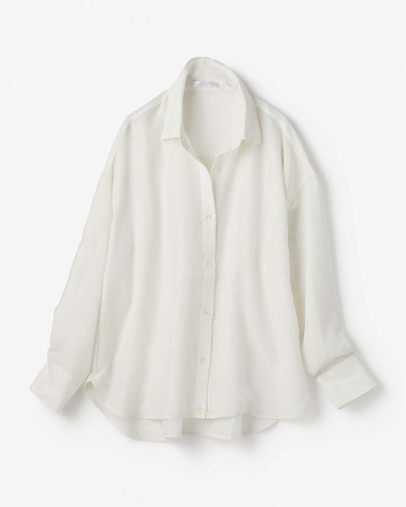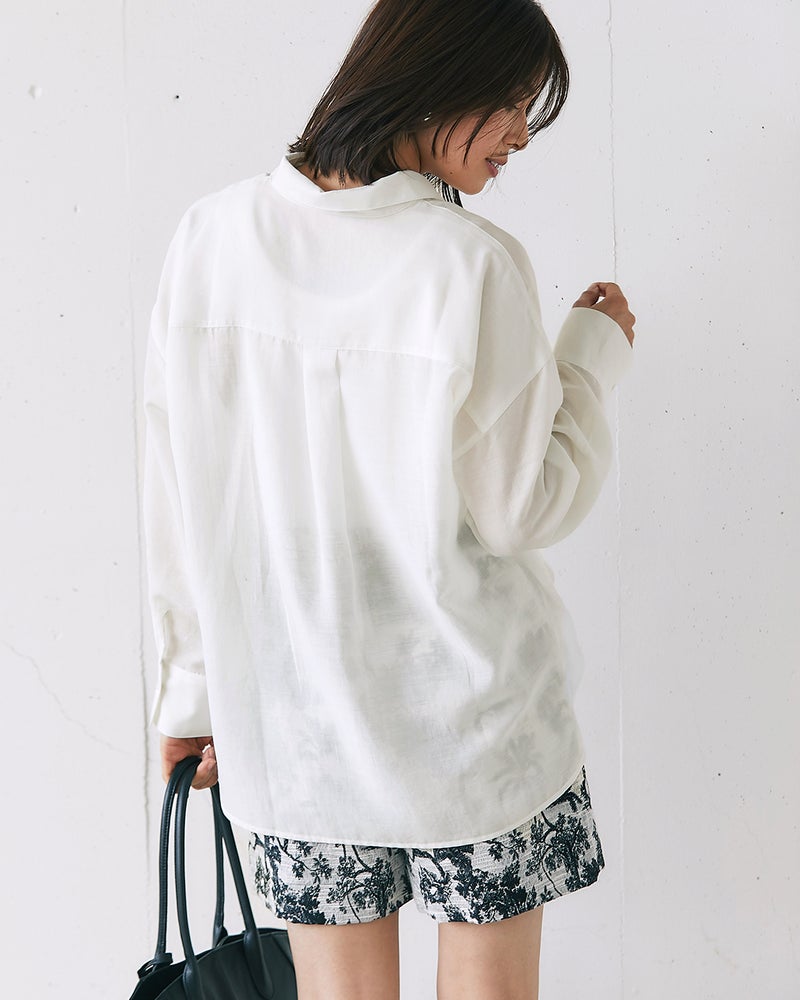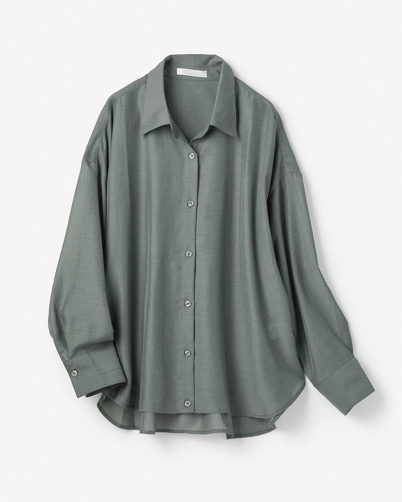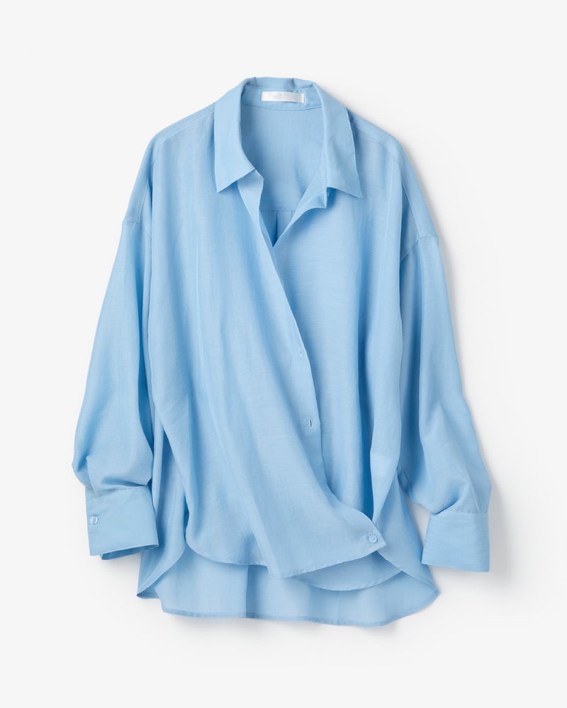 さらっと軽くドライなシアー素材のシャツ。ヒップラインの隠れる長めの丈感で、暖かい時期は羽織りとしても大活躍。さらに裾のボタンをカシュクール風に留めるアレンジも楽しめます。
