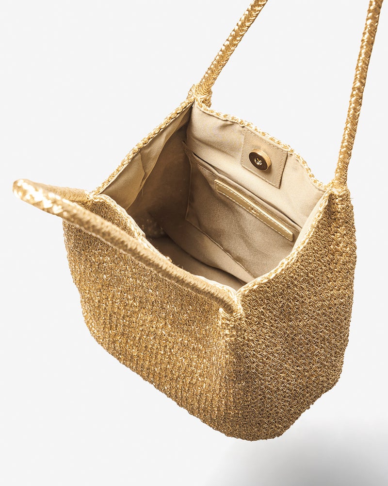 メタリック糸をミックスしたポリエステル素材を緻密に編み上げてつくるバスケットトートバッグ。畳んでもシワが気にならないので、スーツケースに入れておけば、旅先でも大活躍します。