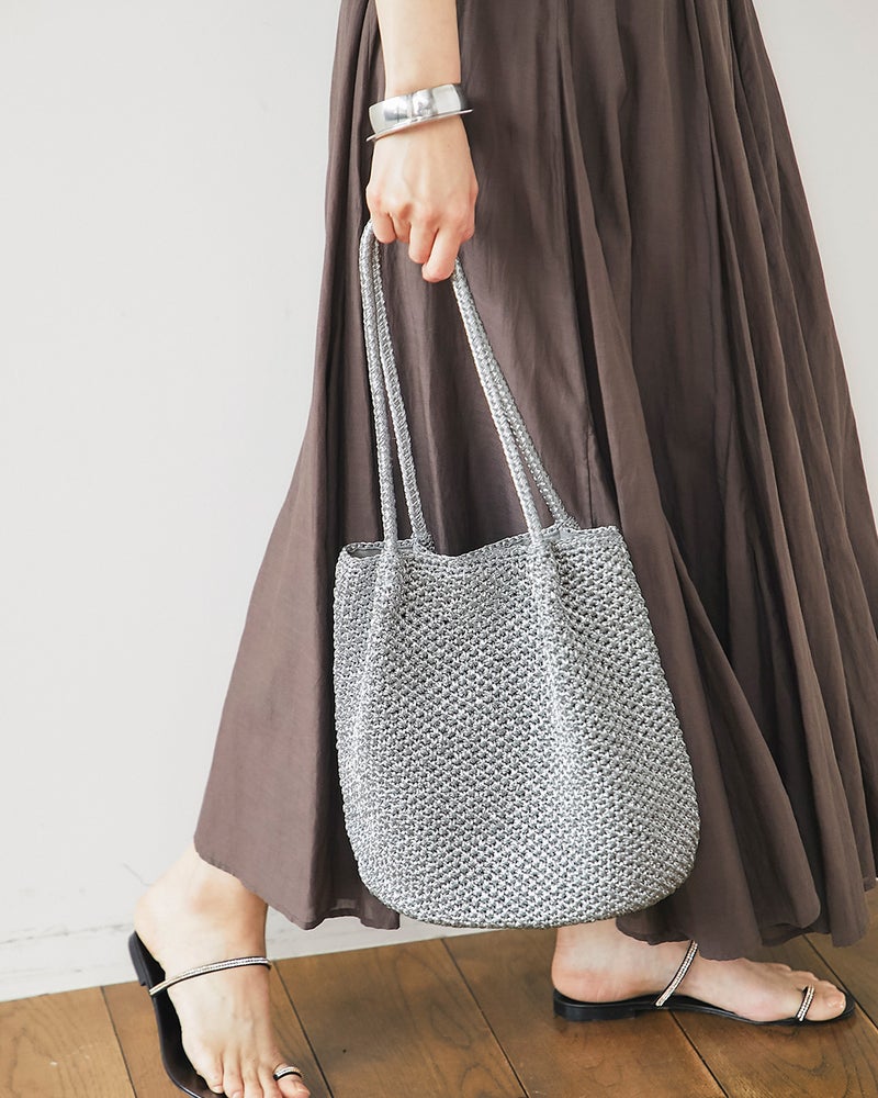 - シンプルで「丁度良い」キラキラ編みバッグ軽くて大きさも丁度良いので、普段使いに便利だと思います。内布付きで、内ポケットも1つあり、鍵やスマホも迷子にならなくて安心です。素材は光沢感のある軽い糸で編まれておりますが、表面はなめらかです。キラキラ感がシンプルな中にも存在感を感じさせてくれます。持ち手が57cmあるの肩掛けができて、底のマチも13.5cmあるので見た目よりもたっぷり収納力があります。