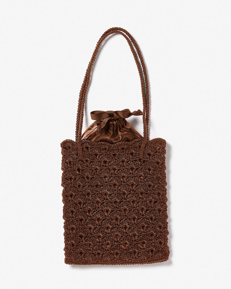 Sサイズは、レースのような繊細な編み地がアクセサリーのような存在感。軽やかにお出かけしたい方や、バッグ2個持ち派の方に便利なサイズです。中にチラリとのぞく巾着タイプのチュールポーチもさりげないアクセントに。