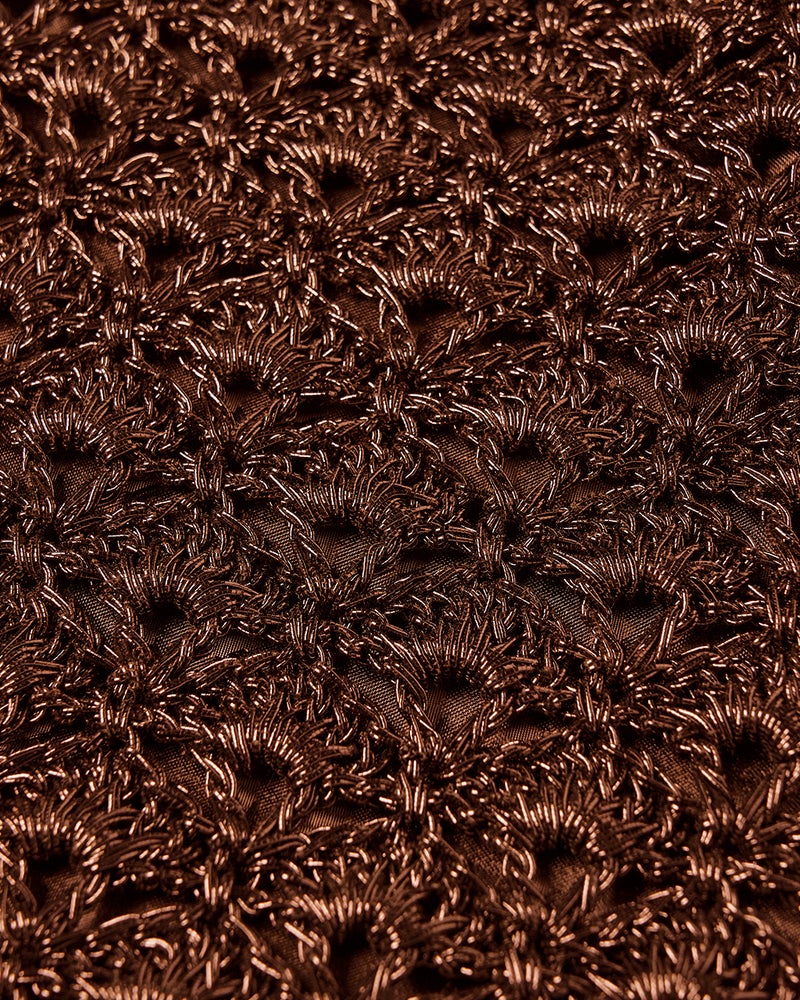 メタリック糸をミックスしたポリエステル素材を緻密に編み上げてつくるバスケットトートバッグ。畳んでもシワが気にならないので、スーツケースに入れておけば、旅先でも大活躍します。