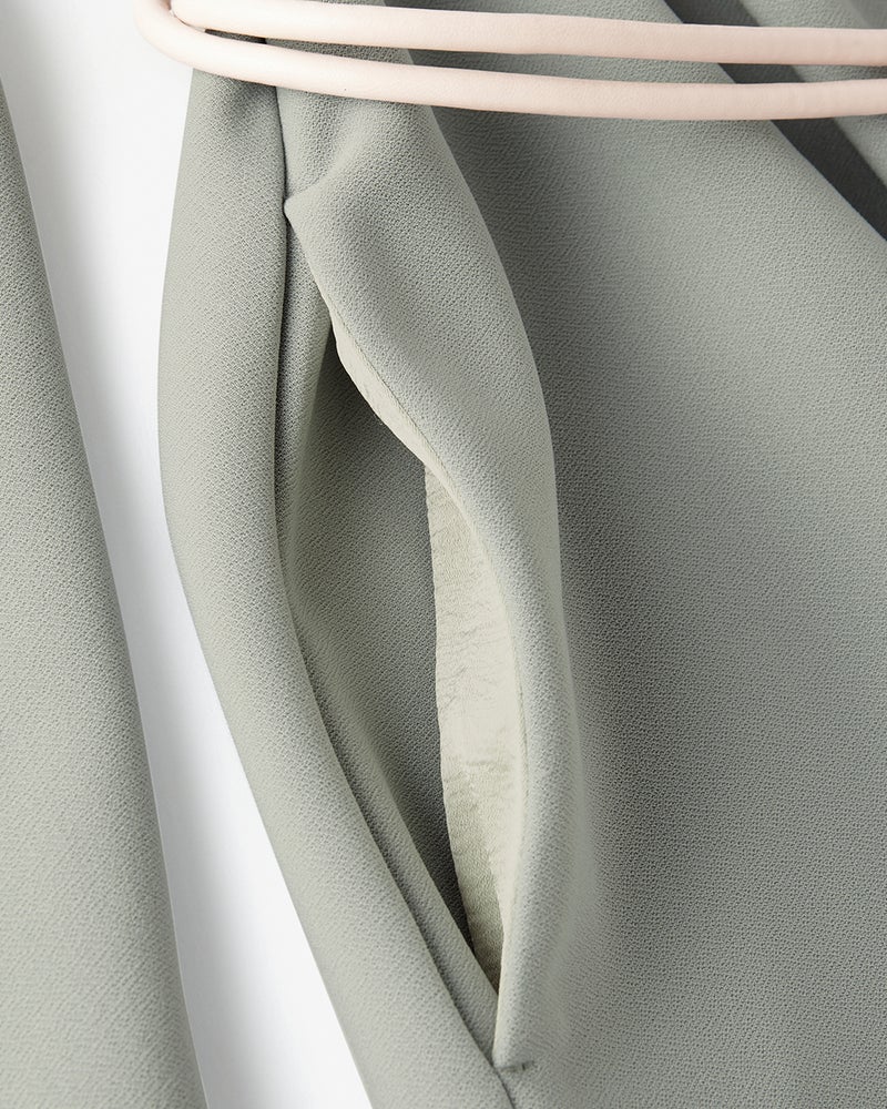 エコレザーのベルトで、きりりとウエストマークできるワンピース。ジョーゼットを思わせる、シボの入ったカットソー生地は、ストレッチが効いて快適な着心地。身頃の生地をたっぷりと使っているから、中で身体が泳ぐようなシルエットが楽しめます。ネックラインには、ツヤのあるサテン素材を使用。