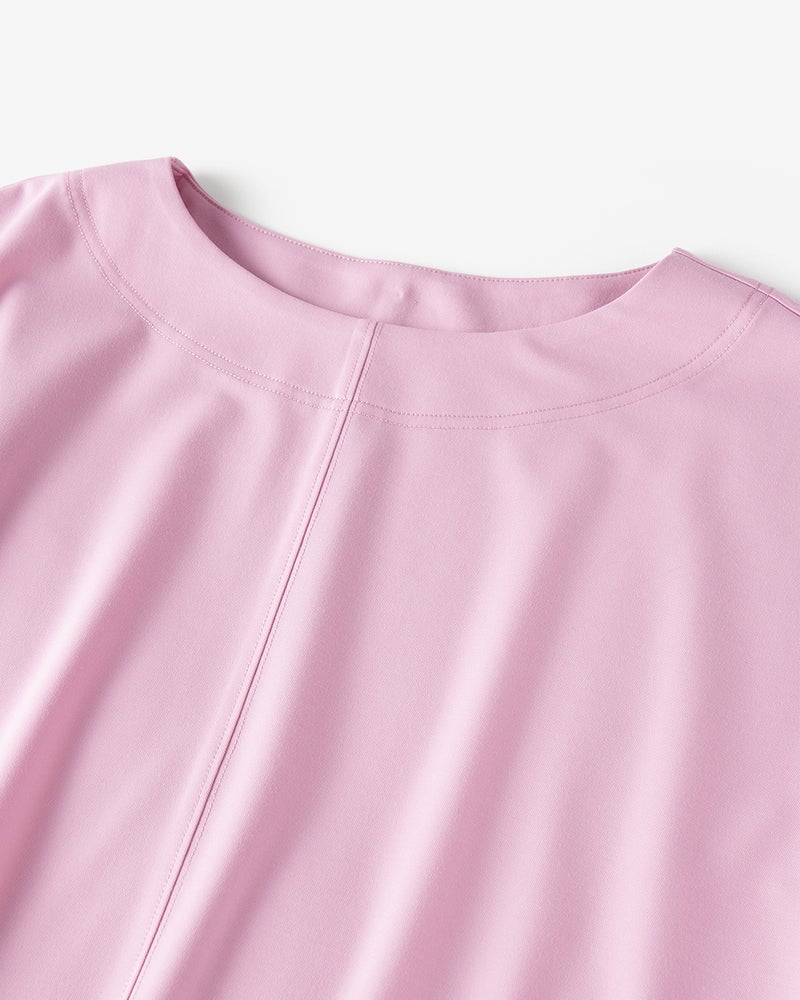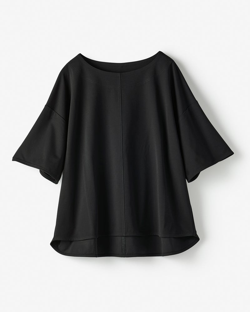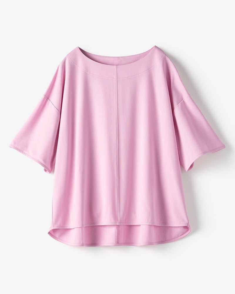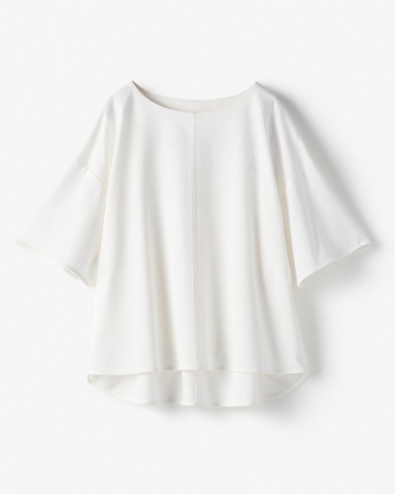涼しく着られるワイドな身幅のカットソー。袖を通しただけで、たちまち“今”の空気感に。ワイドパンツなど、ボリュームのあるボトムスとも好バランス。鹿の子編みの生地は肌あたりがさらりと心地よく、爽やかな着心地です。