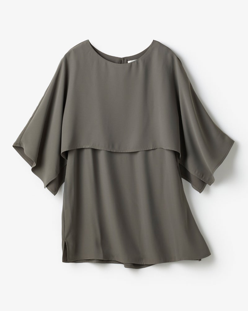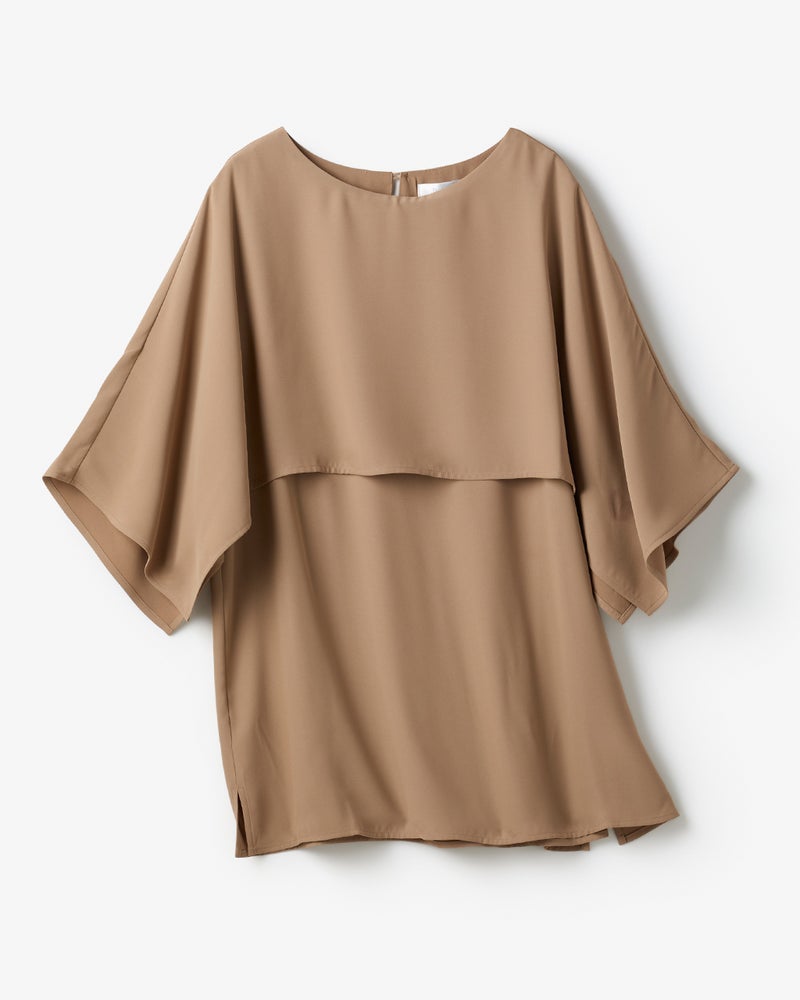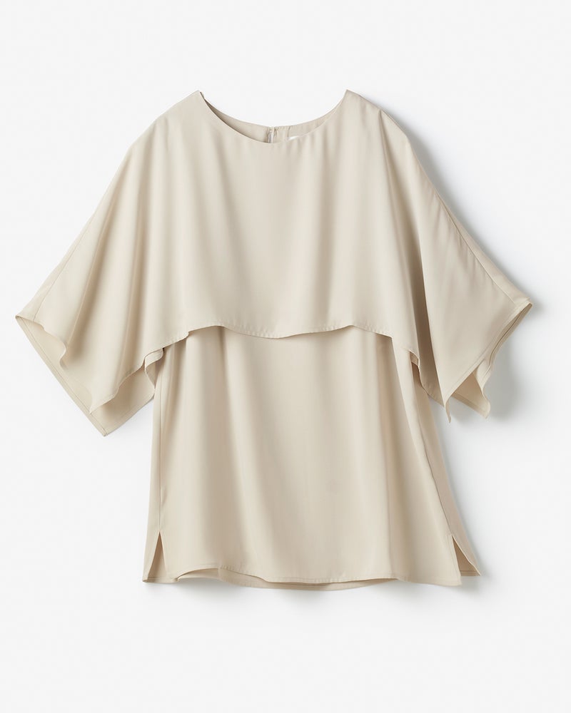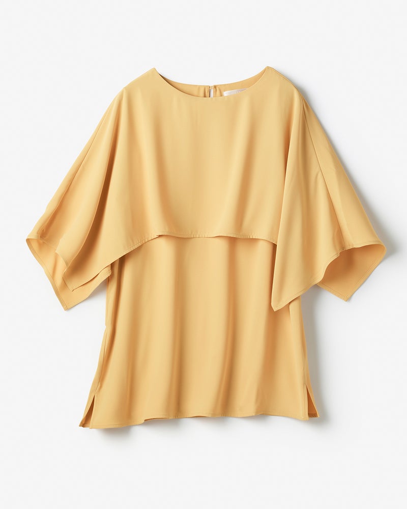 1枚のトップスに見えますが、実はノースリーブにケープを重ねたようなデザイン。肩回りや二の腕をカバーしながら、涼しく過ごせます。素材はドレープが美しいバックサテンジョーゼット。ほのかな光沢が上品で、オフィスでの打ち合わせから会食までこなせる1枚です。同素材のパンツと合わせて、セットアップコーデもおすすめ。