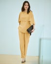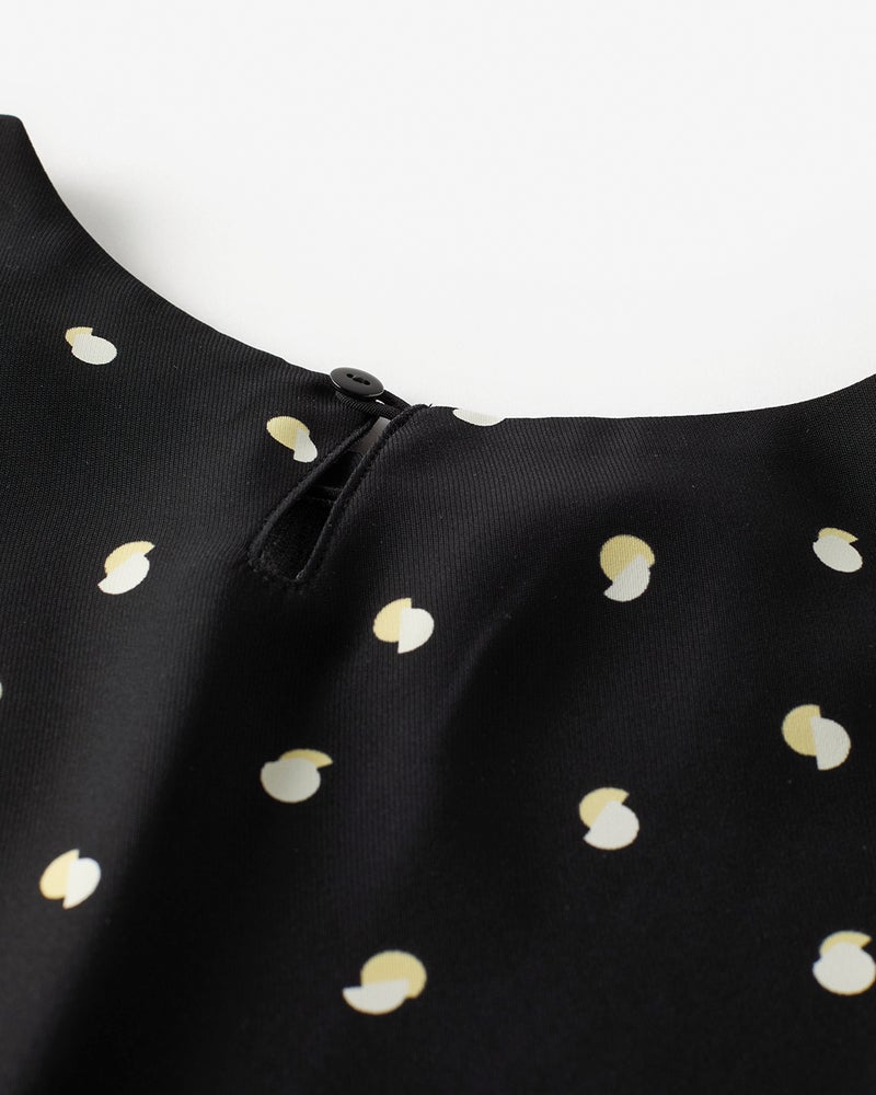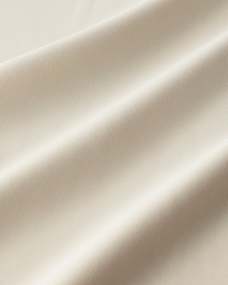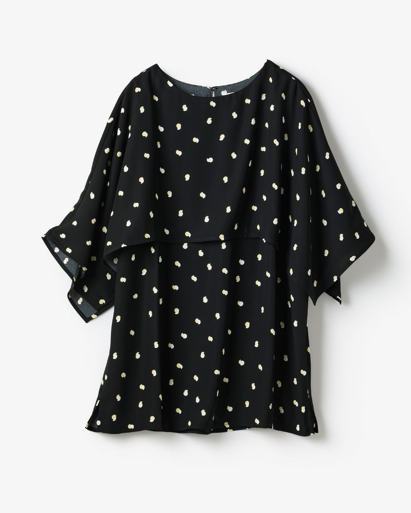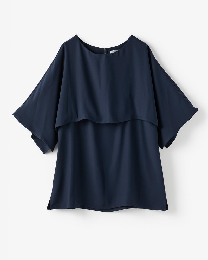 1枚のトップスに見えますが、実はノースリーブにケープを重ねたようなデザイン。肩回りや二の腕をカバーしながら、涼しく過ごせます。素材はドレープが美しいバックサテンジョーゼット。ほのかな光沢が上品で、オフィスでの打ち合わせから会食までこなせる1枚です。同素材のパンツと合わせて、セットアップコーデもおすすめ。