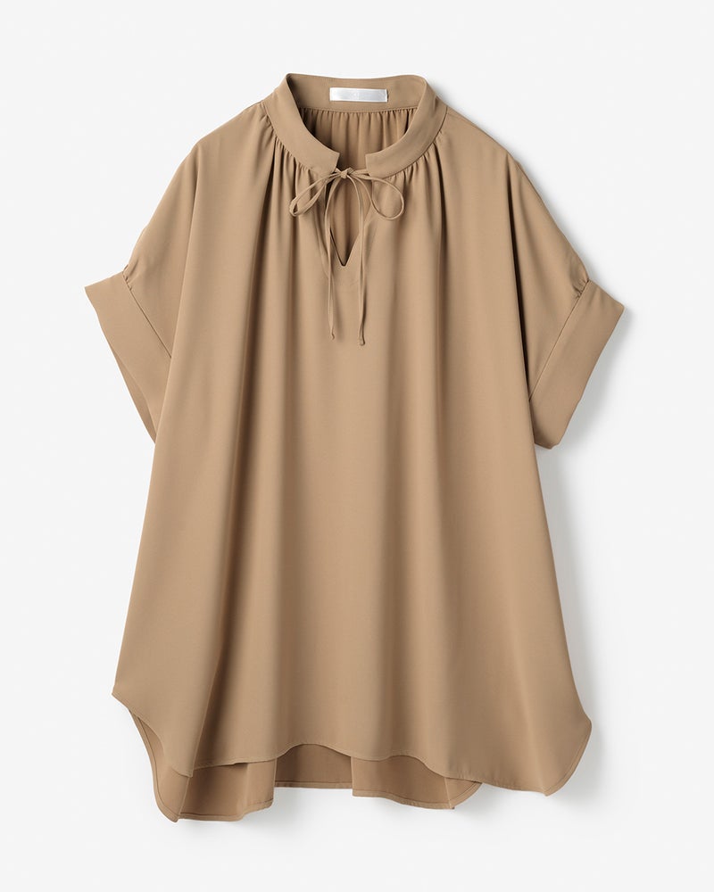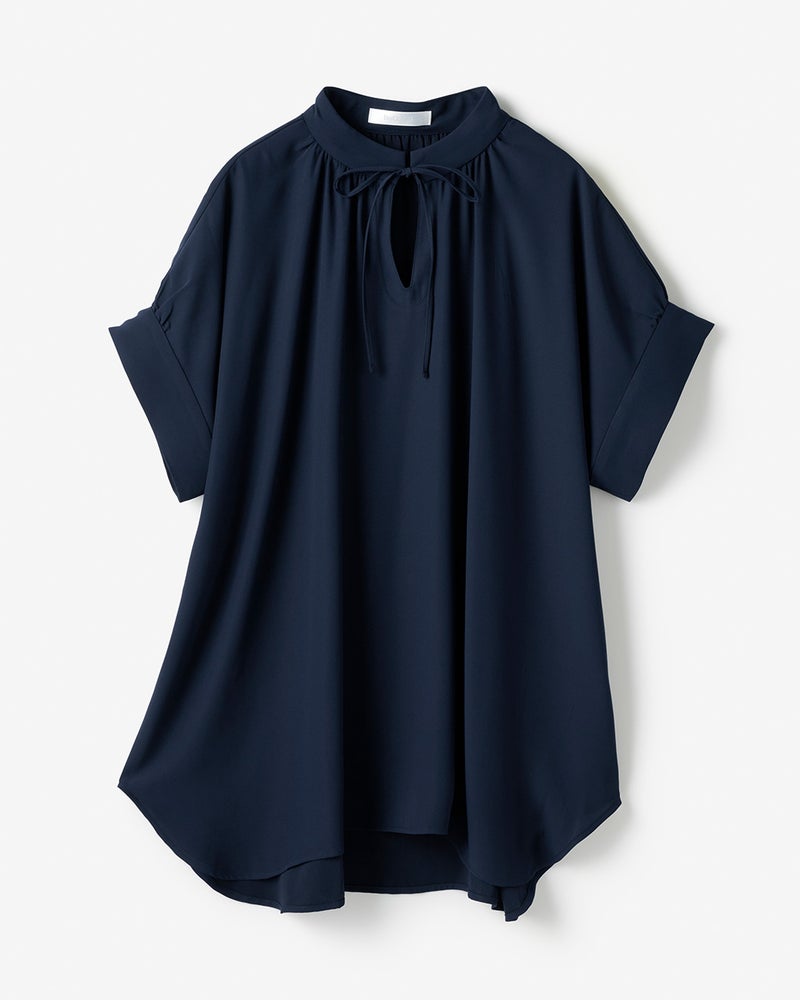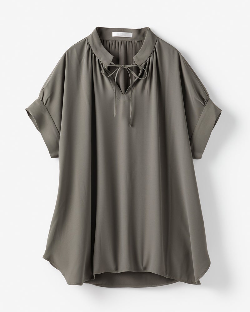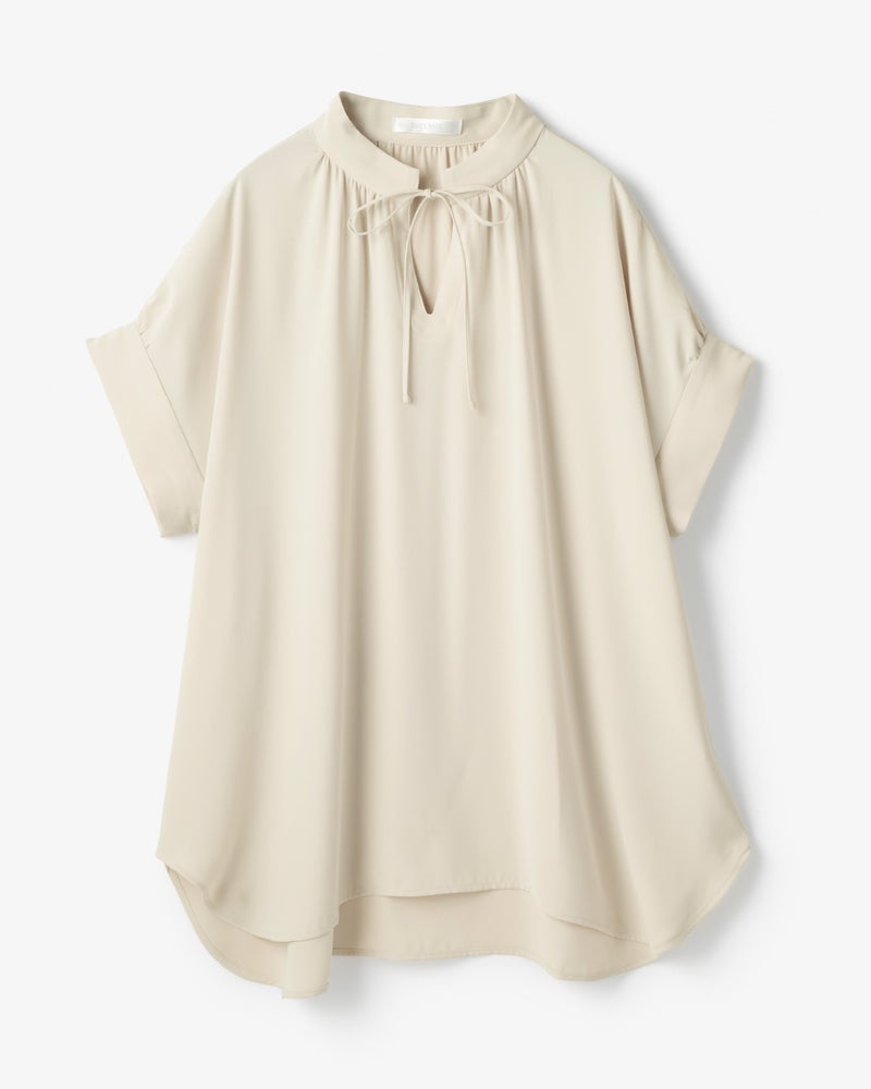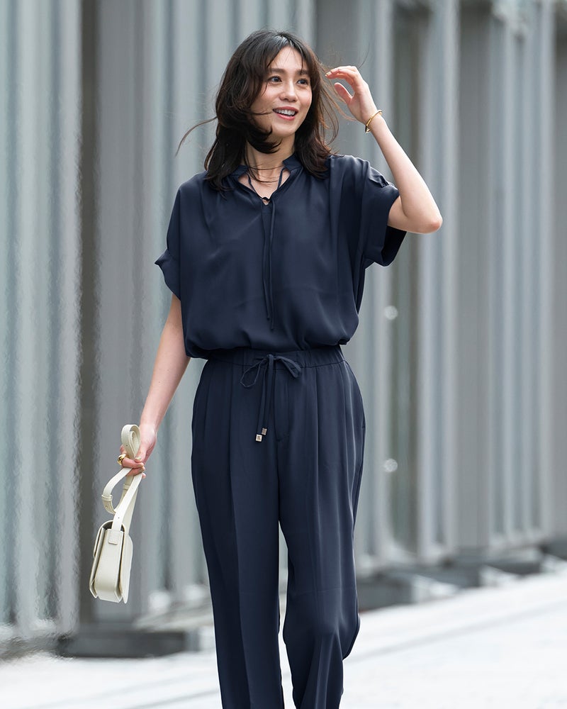 衿部分にドローストリングを入れたトップスは、結べばリボンのようにキュートな印象、そのままならアクティブな表情に。ドレープが美しいバックサテンジョーゼット素材で、オフィスでもお出かけでも上品な空気感を醸し出します。同素材のパンツとのコーディネートで、セットアップとしても活躍します。