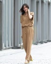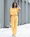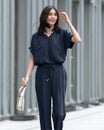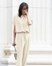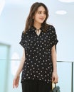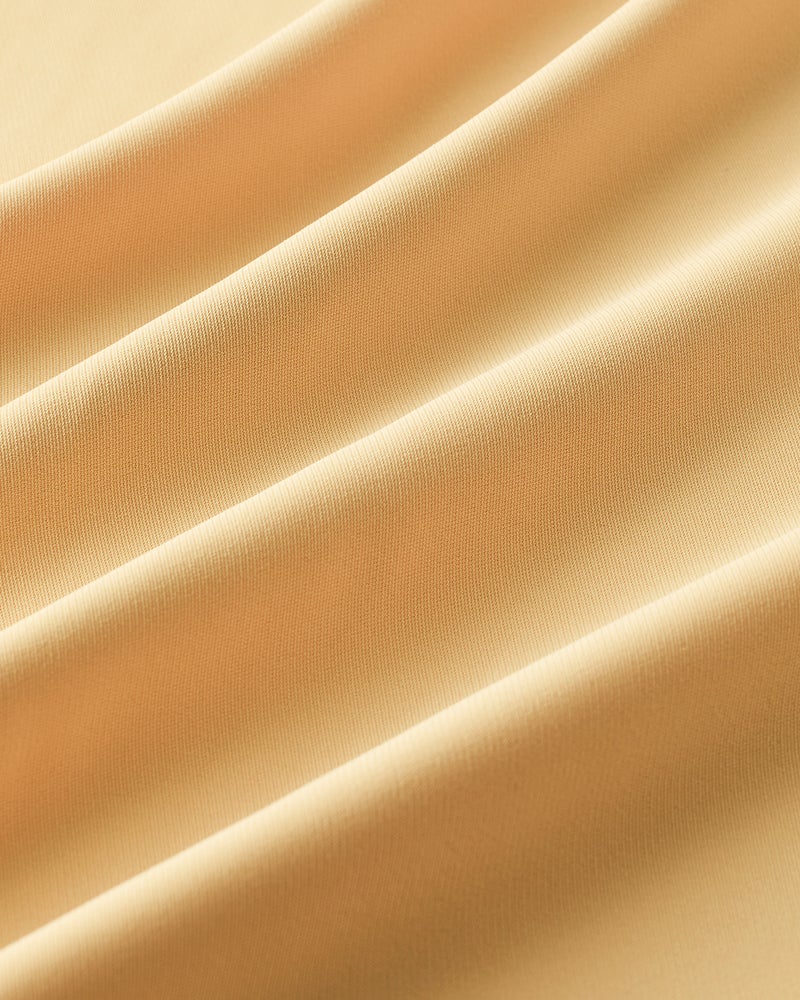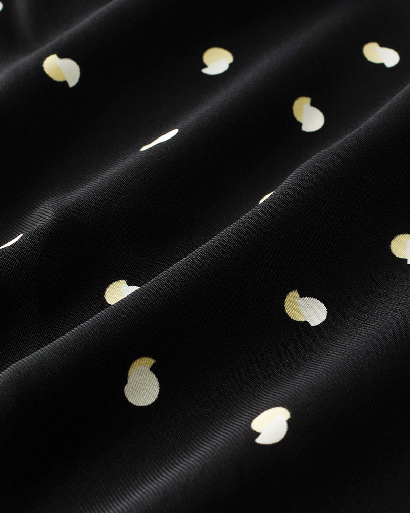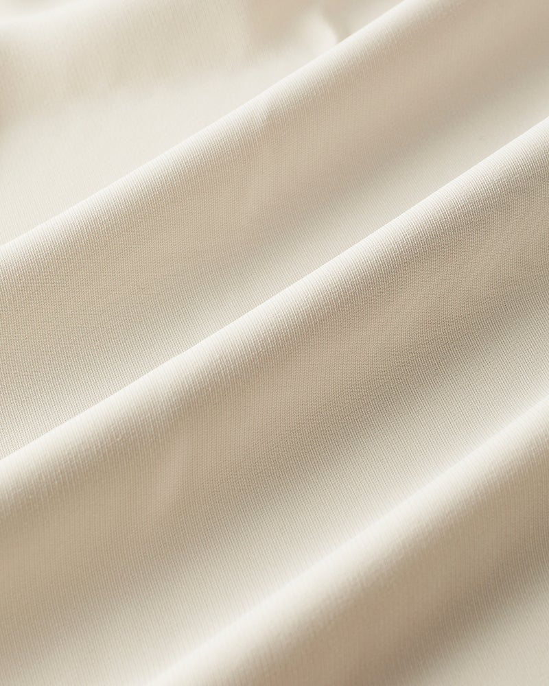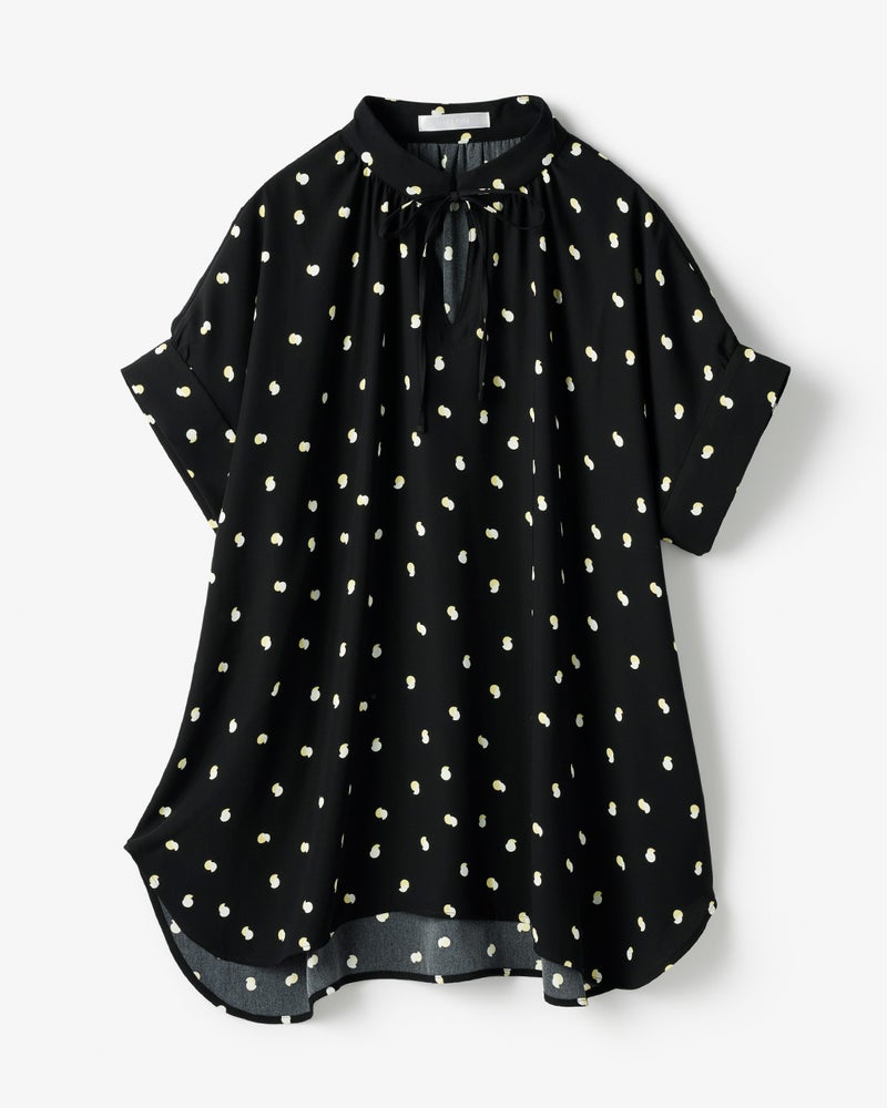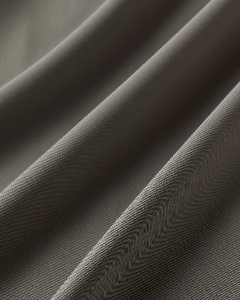 衿部分にドローストリングを入れたトップスは、結べばリボンのようにキュートな印象、そのままならアクティブな表情に。ドレープが美しいバックサテンジョーゼット素材で、オフィスでもお出かけでも上品な空気感を醸し出します。同素材のパンツとのコーディネートで、セットアップとしても活躍します。