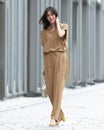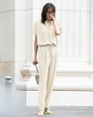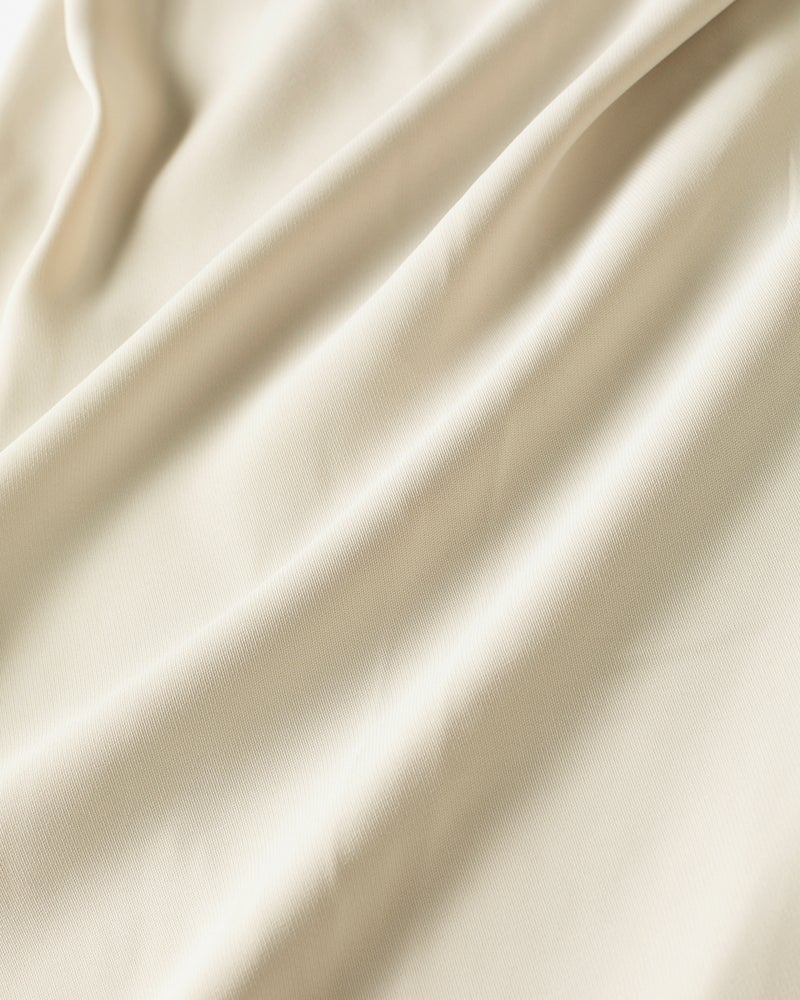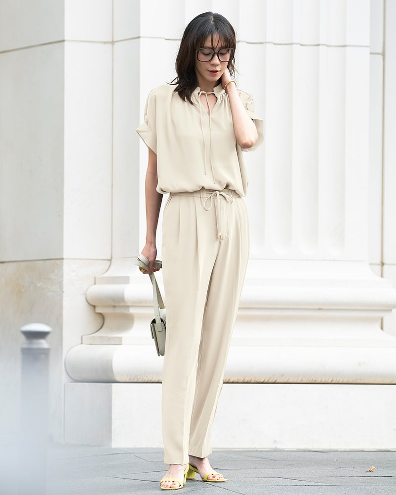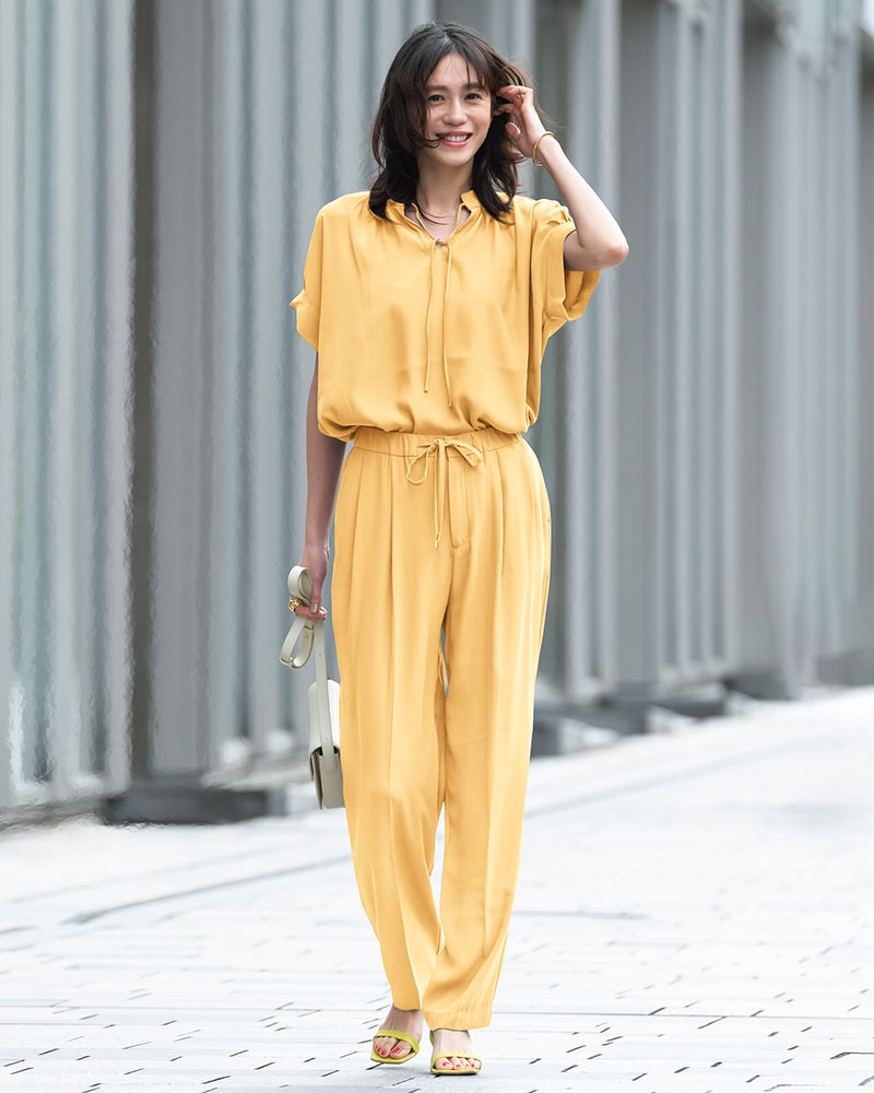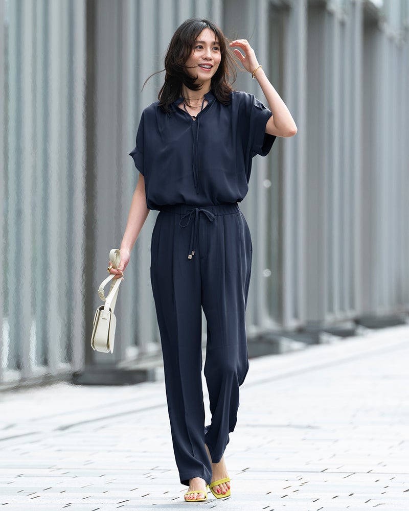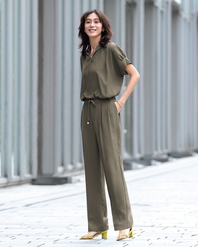 旬のワイドパンツは、なめらかな落ち感がスタイリッシュ。ウエスト部分はドローコードとゴムで、ラクなはき心地です。素材は、縦に落ちるドレープが美しいバックサテンジョーゼット。ほのかな光沢が上品で、オフィスでの打ち合わせから会食までこなせる1枚です。同素材のブラウスと合わせた、セットアップコーデもおすすめ。