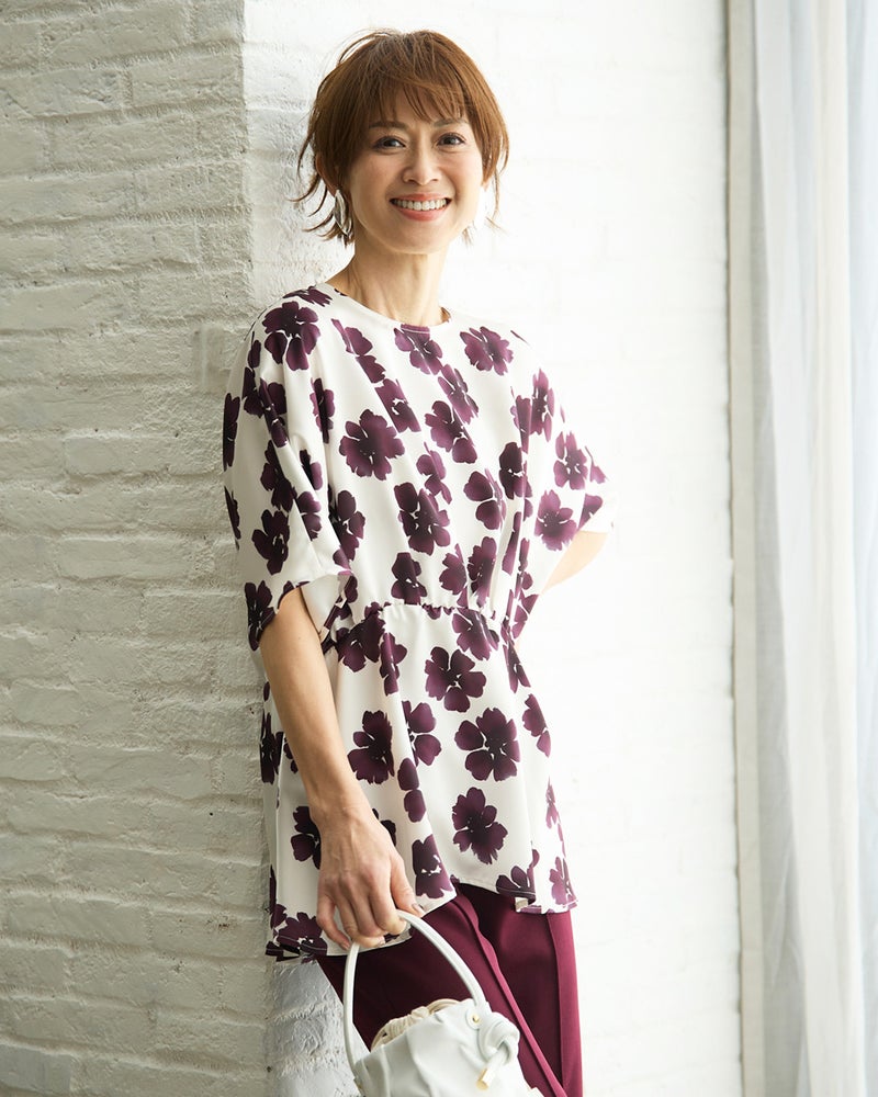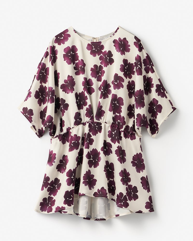 ハリのあるダブルサテンにフローラルプリントを施した、1枚で華やかになれるブラウス。きゅっと絞られたウエストギャザーで、メリハリUP。