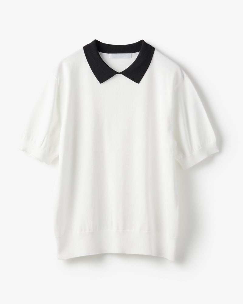 衿を配色仕立てにしただけで、フェミニンな愛らしさが際立つポロ衿ニット。なめらかなセルロース混の糸をハイゲージに編み上げ、きれいな表面感に仕上げました。トップスがコンパクトにまとまるので、ロングスカートやワイドパンツとも好相性。