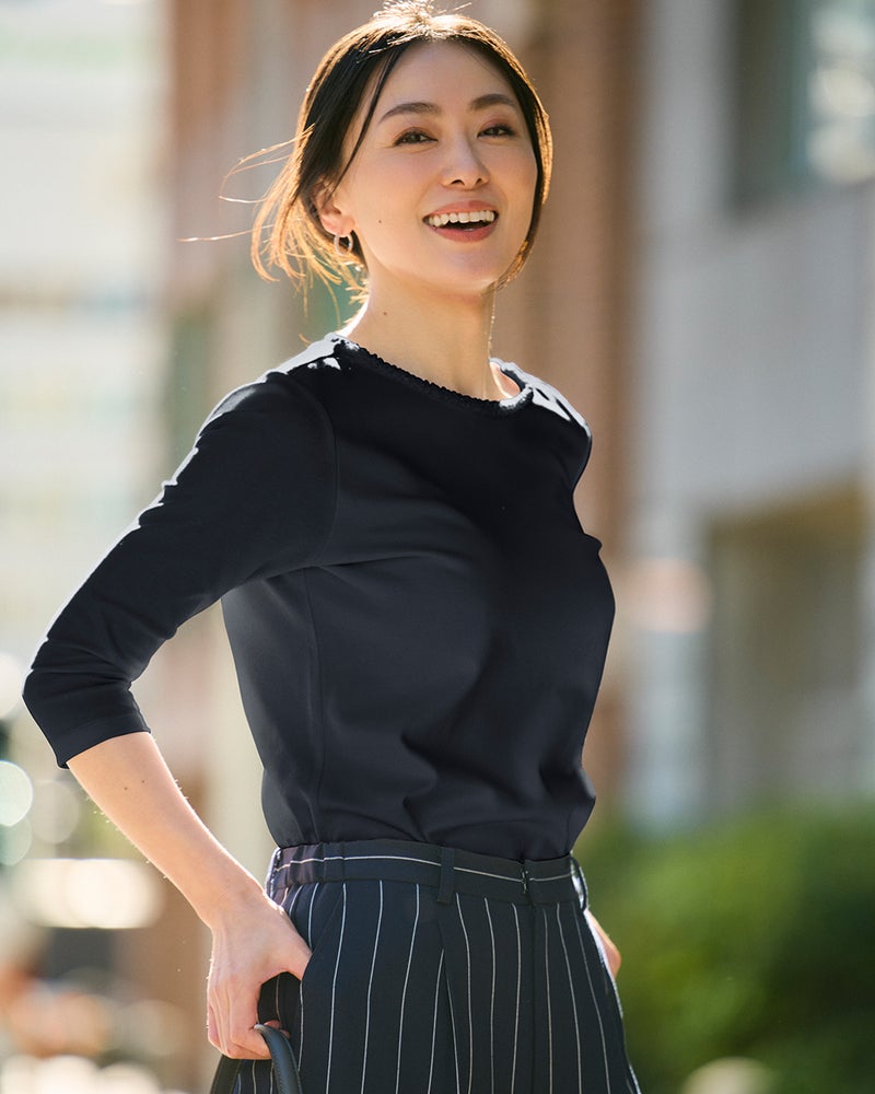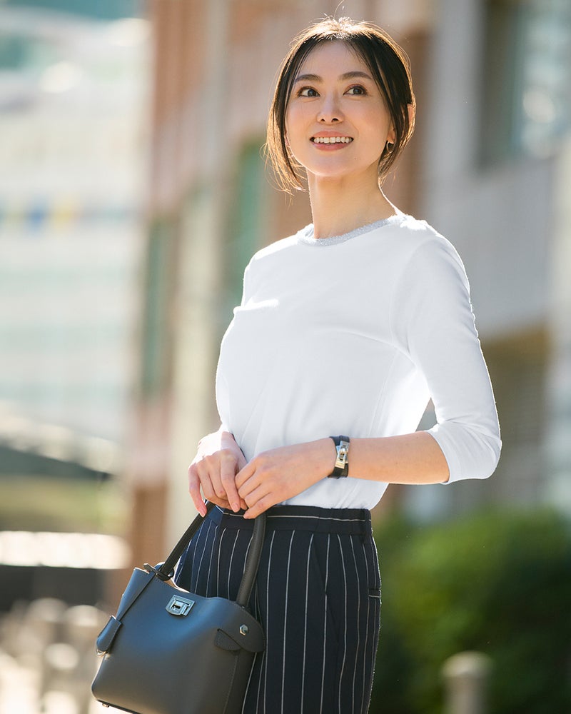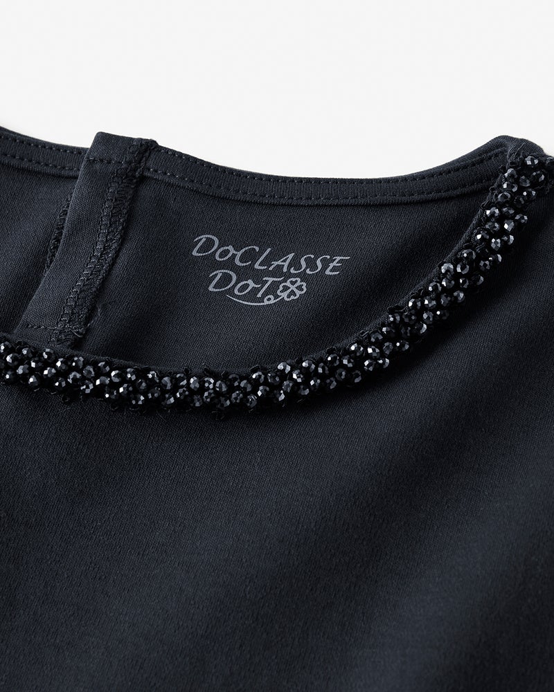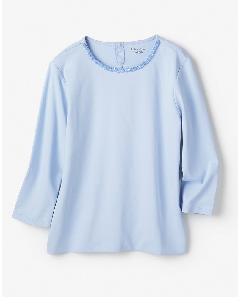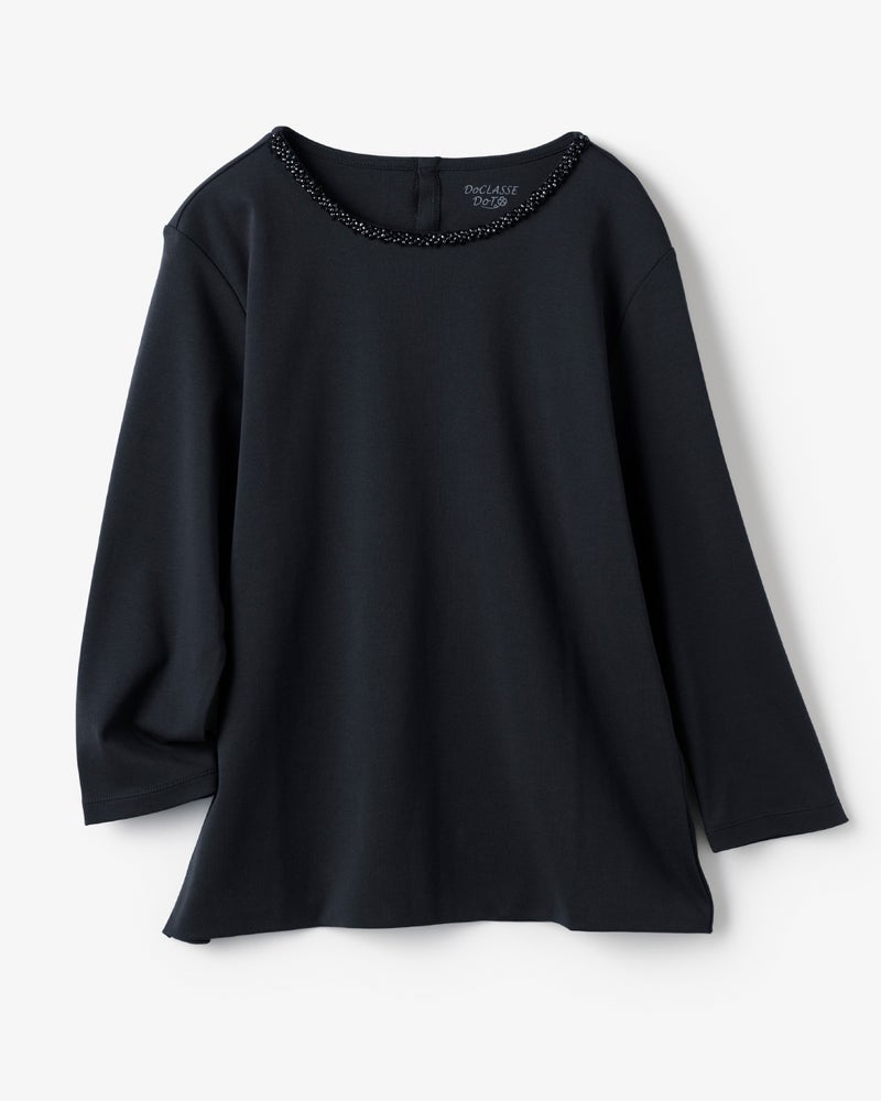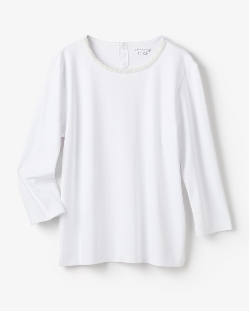 Tシャツなのに、アクセサリー級。首もとを彩るビジューが、いつものTシャツスタイルを一瞬で格上げ。定番人気のクルーネックをベースに、細かいビジューをちりばめた華やかデザイン。1枚ではもちろん、ジャケットやカーデのインにすればいつものスタイルも印象的に。