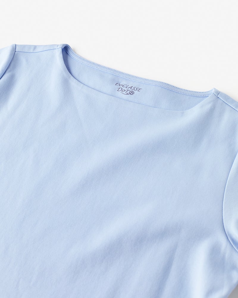 ドゥクラッセだけの「W仕立て」ブランド創成期からのベストセラー、ドゥクラッセTシャツ。1枚で着こなしの主役になるTシャツとして大人の女性から愛されてきました。前身頃を2重に仕立てた下着の見えない機能性、袋縫いで仕上げた贅沢な製法は、正にブラウスやジャケットにも負けない品格のTシャツとして大好評をいただいています。 -
