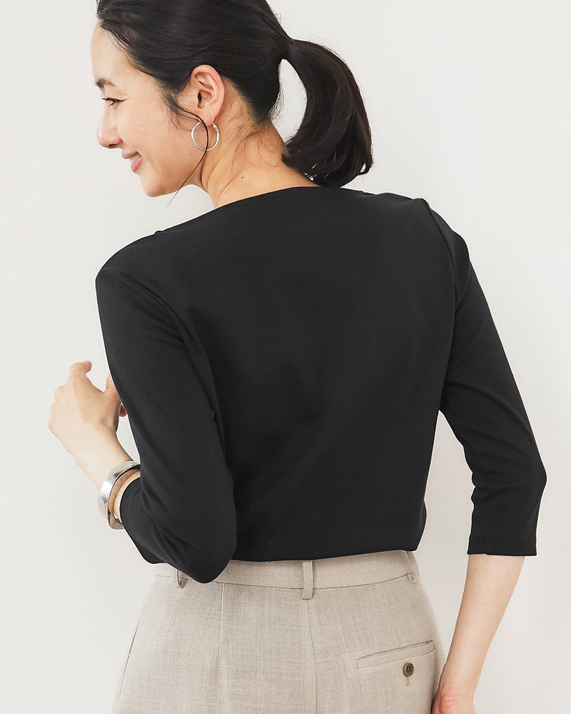 普段のサイズ:L 着用サイズ:M - 生地はなめらかな肌触り。伸縮性があり楽ちん。首元は狭すぎず開きすぎず顔回りがキレイに見えます。前身ごろを2重に仕立ててあるため下着のラインが透けて見えないのも嬉しい。袋縫いでキレイな仕上げなのでジャケットの下に着るとお仕事に、セミワイドパンツを合わせれば流行りのカジュアルスタイルに、組合わせで一年中オシャレが楽しめます。