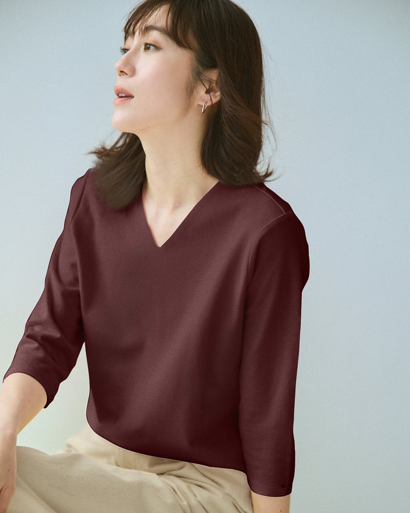 露出を控えながらクールに着こなせるVネックは大人の女性に人気のデザイン。ジャケットインにも似合います。