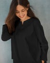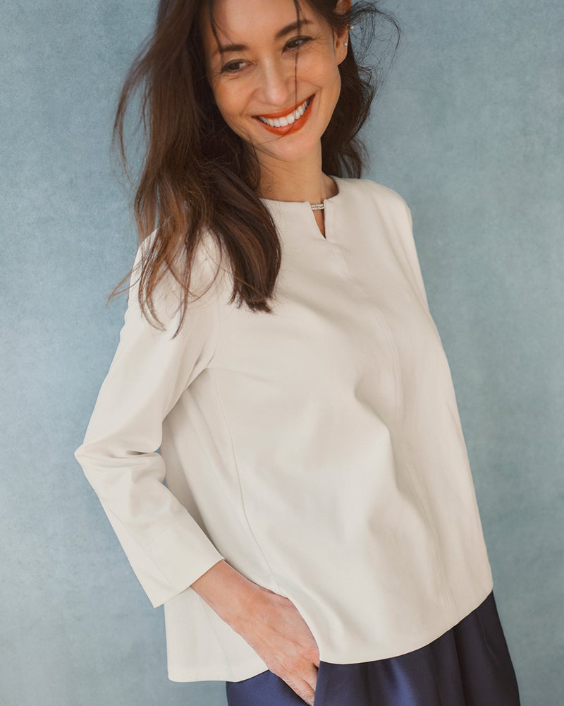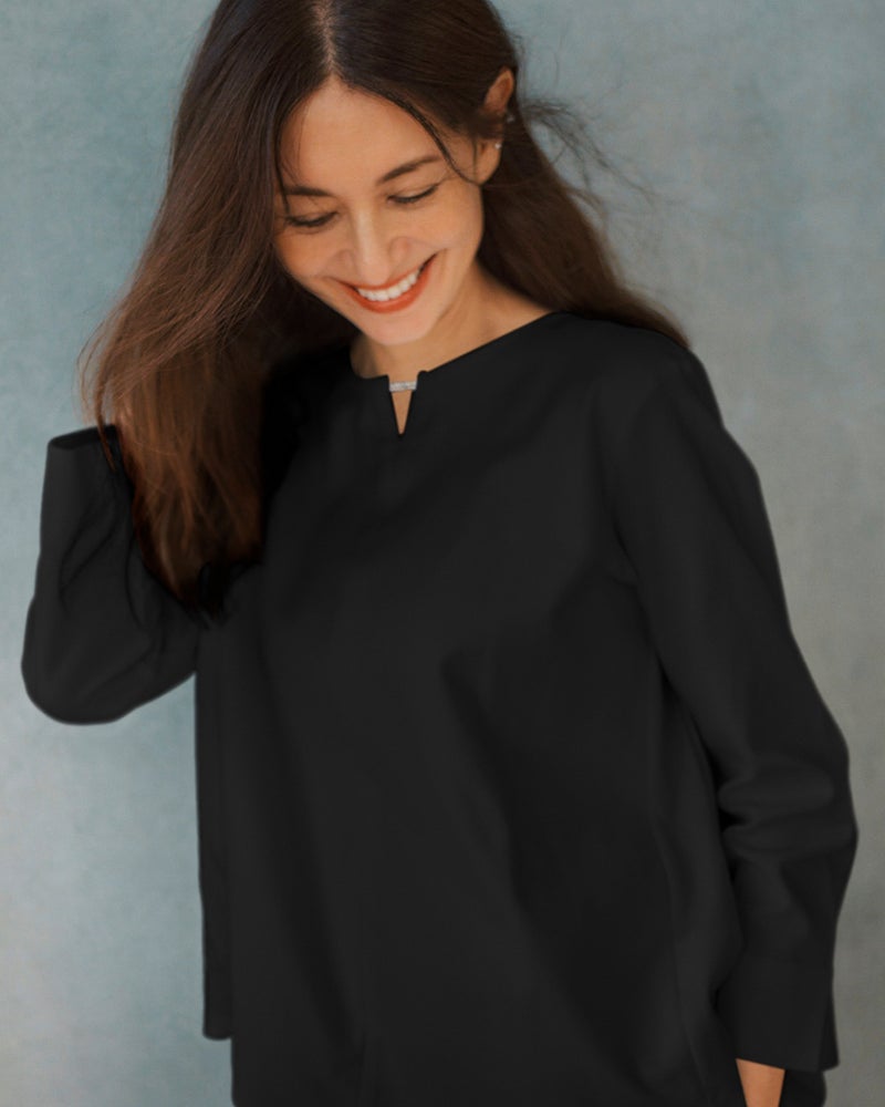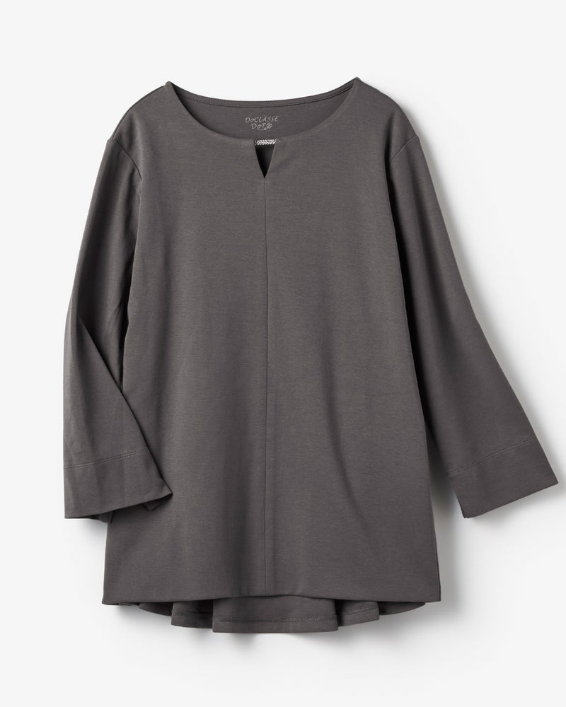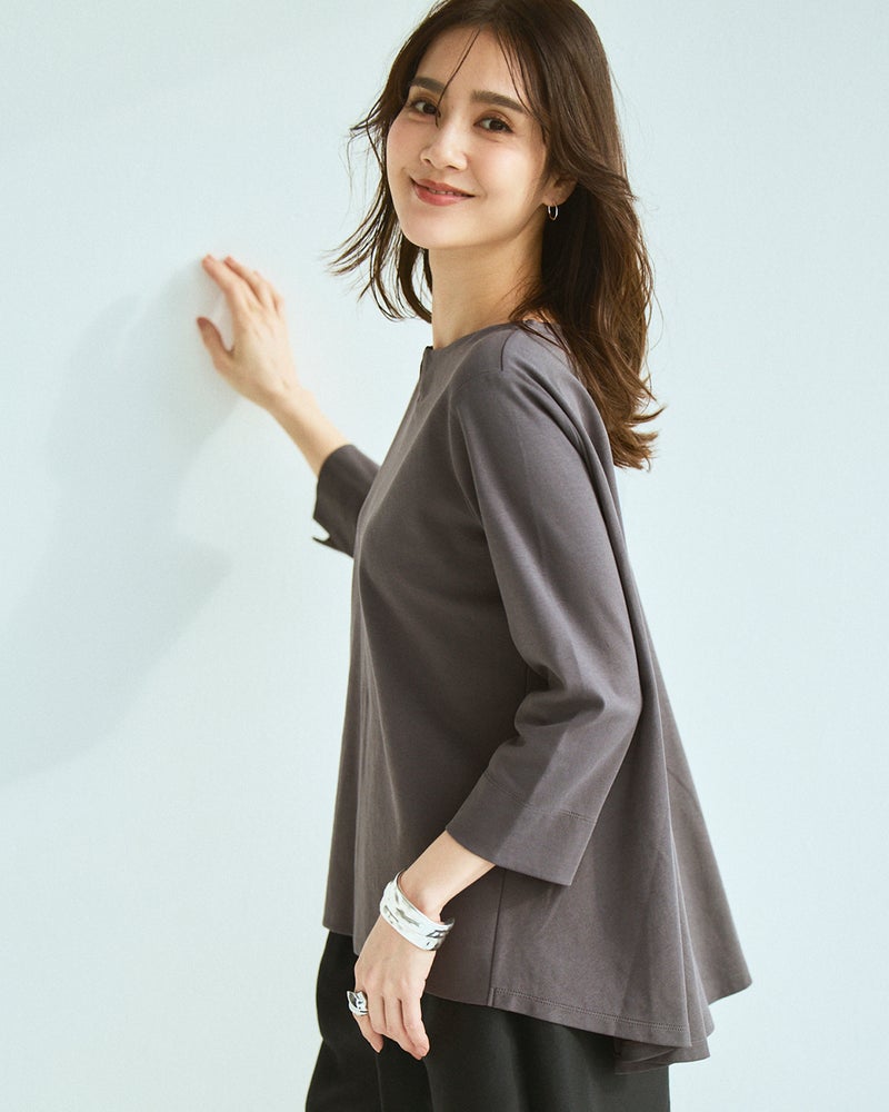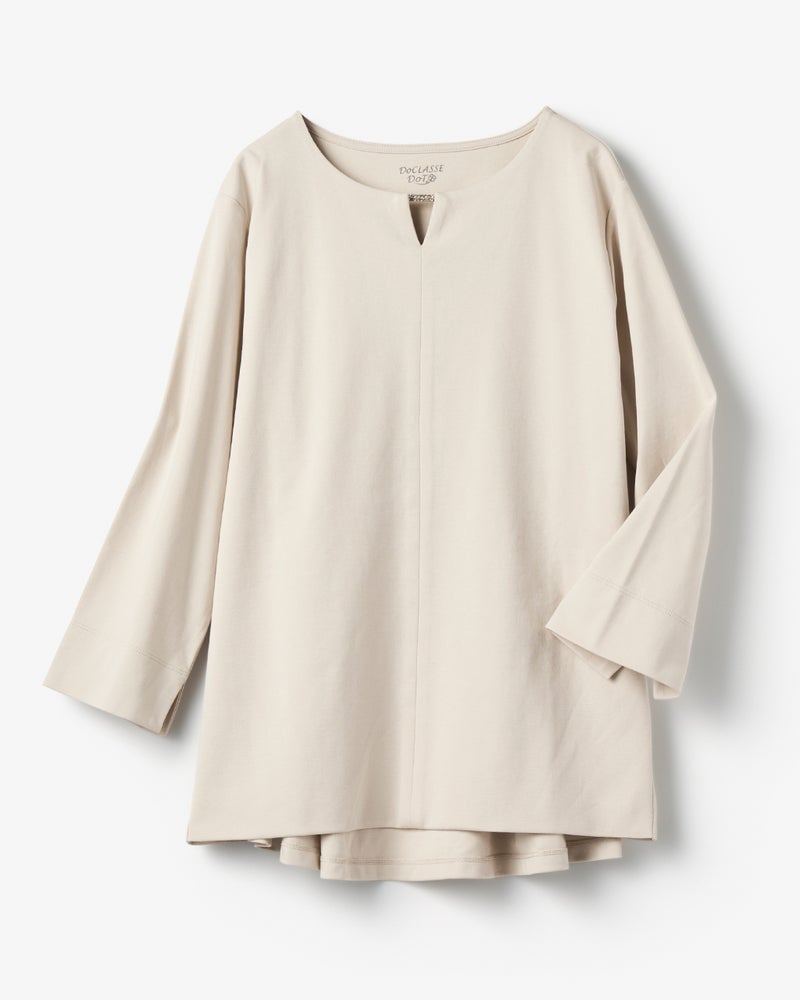 Tシャツなのに、アクセサリー級。首もとを彩るビジューが、いつものTシャツスタイルを一瞬で格上げ。キーネックにラインストーンベルトを施した洗練デザイン。体型も美しくカバーするフレアシルエット、ブラウス風の袖口デザインなど細部までキレイにこだわった1枚。