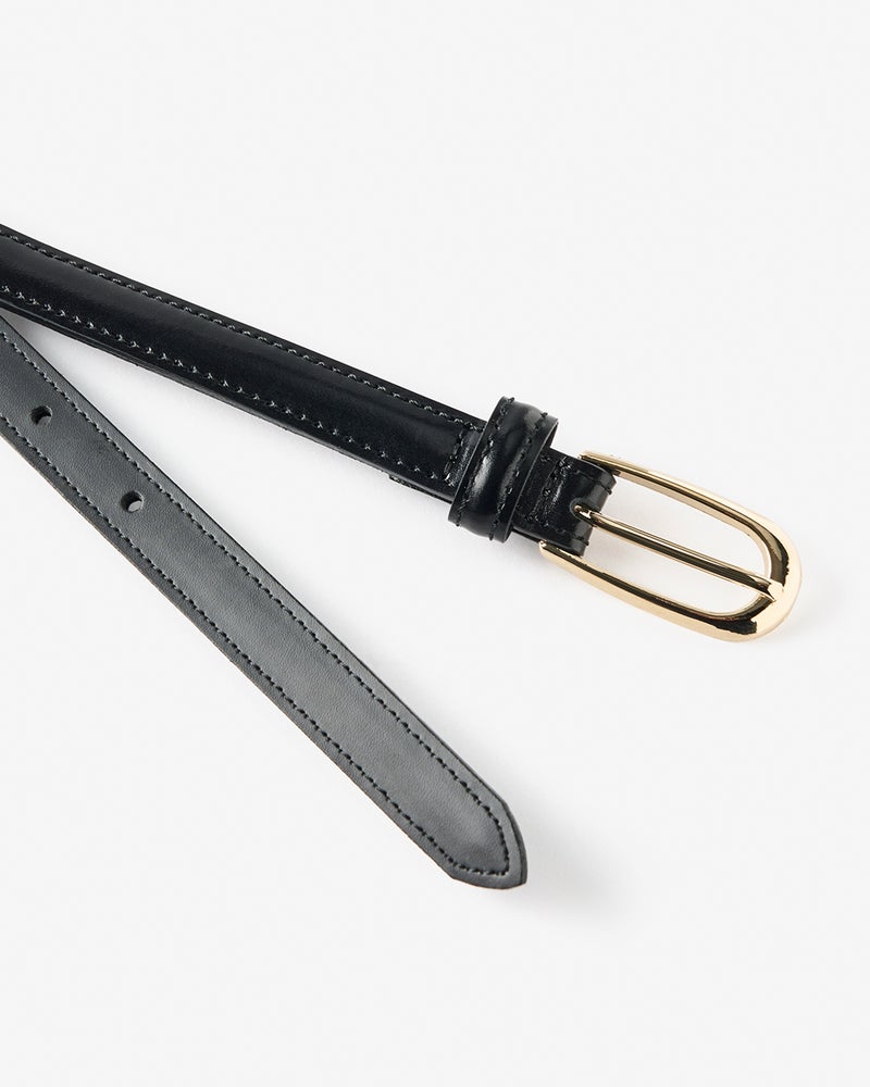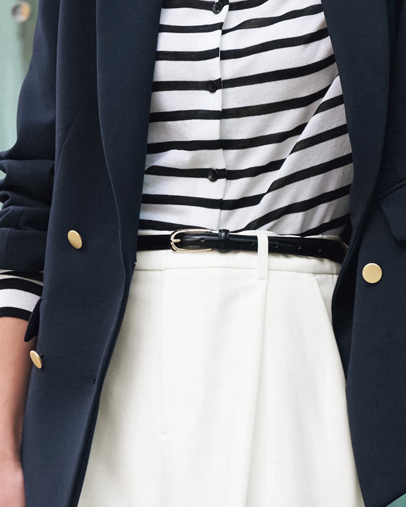 国産仕立てのしっとりなめらかな上質レザーを使用した細ベルト。すっきりとスリムなデザインは、パンツはもちろんワンピースのアクセントにも。