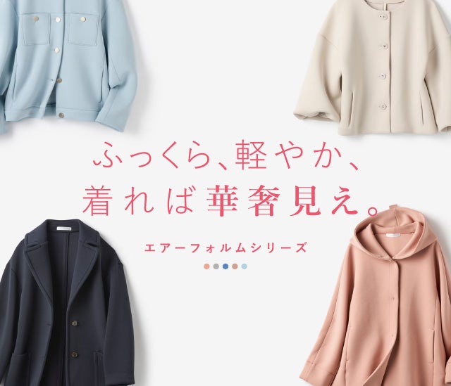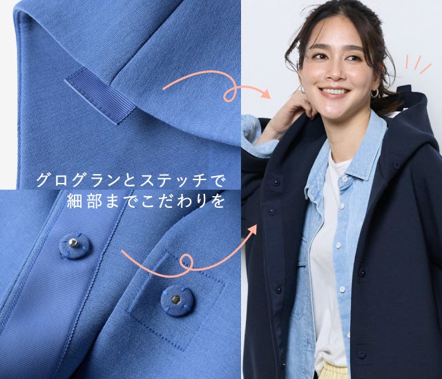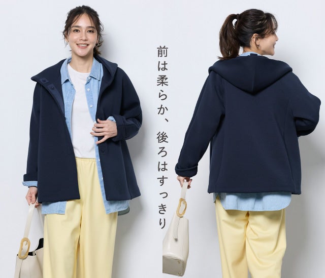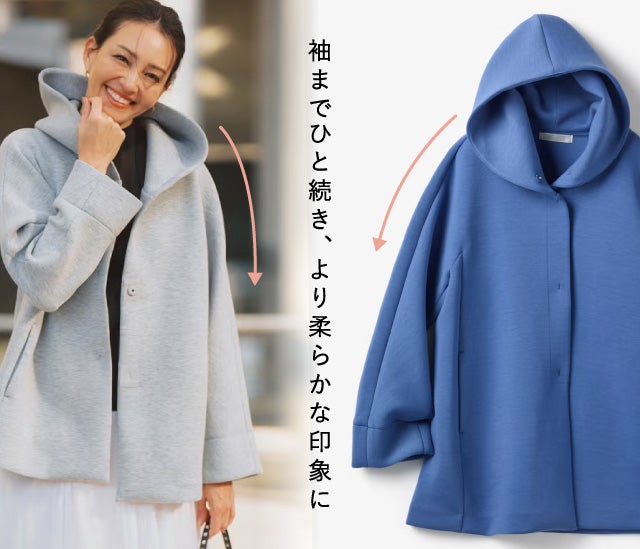 光沢ストレッチ素材「エアーフォルム」で仕立てた大人気のフードジャケットが、立体裁断の匠の手で美しく更新!ゆったりフォルムでありながら着るとすっきり華奢見えする、進化した小顔コートをぜひ体感してください。