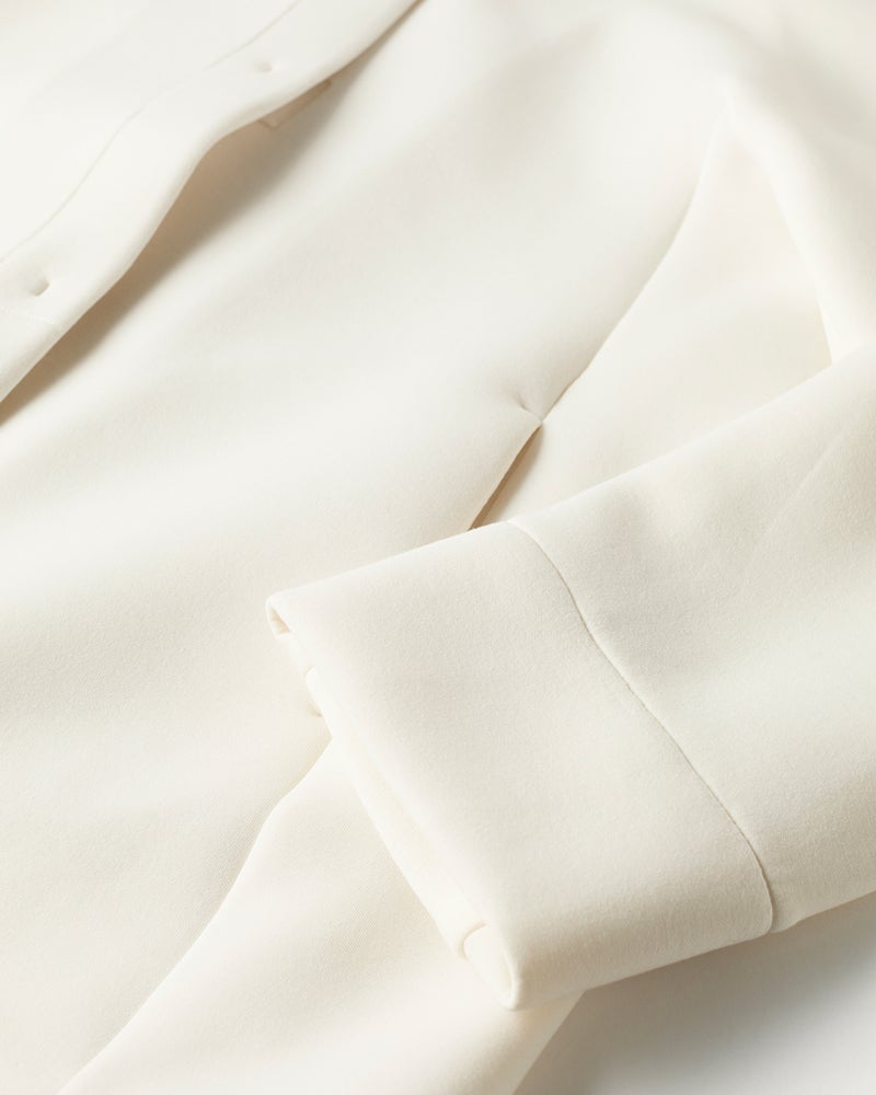 - 贅沢に生地を使ったこだわりの立体裁断立体裁断の名人が手がけたカッティングが自慢。前身頃は袖までひと続きのパターンに。袖で切り替えるよりも生地の用尺を必要とする贅沢な仕立てですが、その分腕が動かしやすく、女性らしい柔らかな印象に仕上がります。