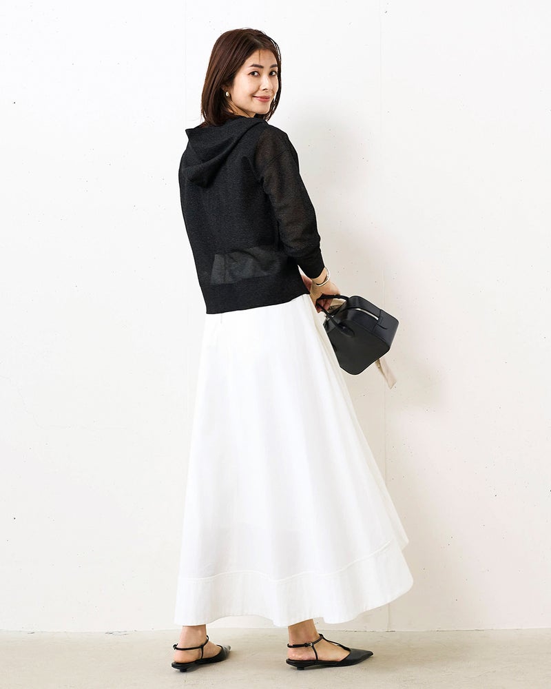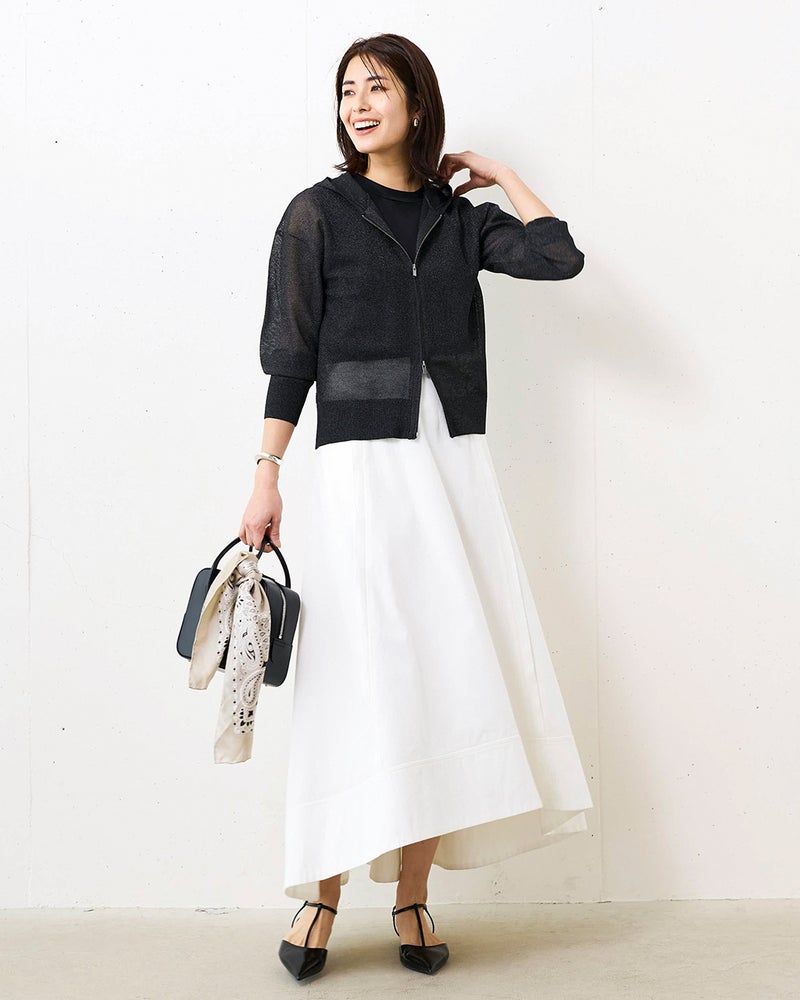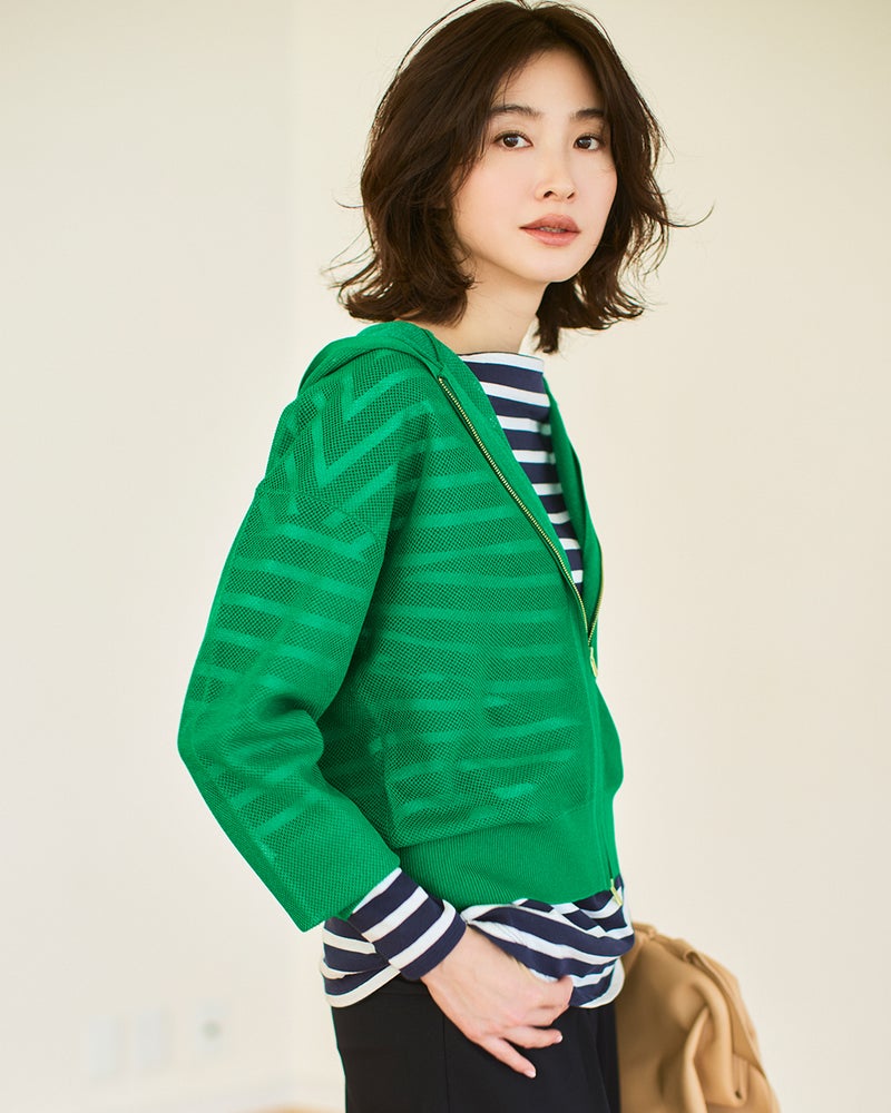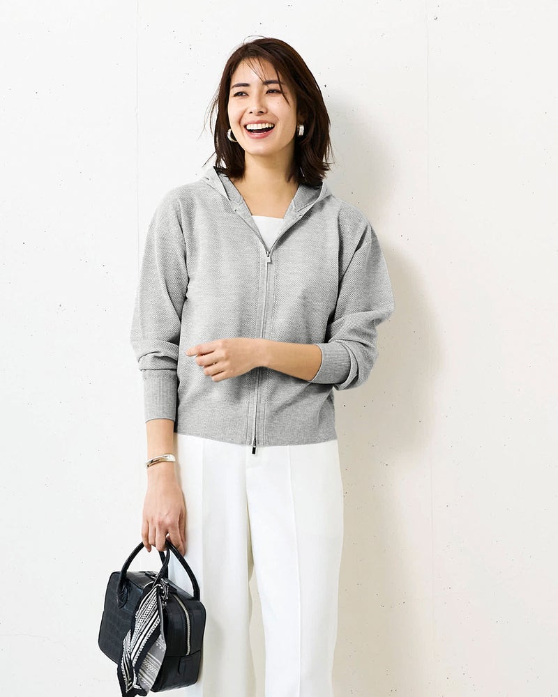 光沢糸をメッシュ編みで仕立てたシアーニットは、大人に似合う上品な透け感がポイント。カジュアルアイテムの代表選手のパーカーも、シアーな質感で大人っぽく。やや短めの丈感で、旬のワイドボトムスに似合うバランスに仕上げました。