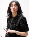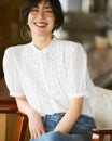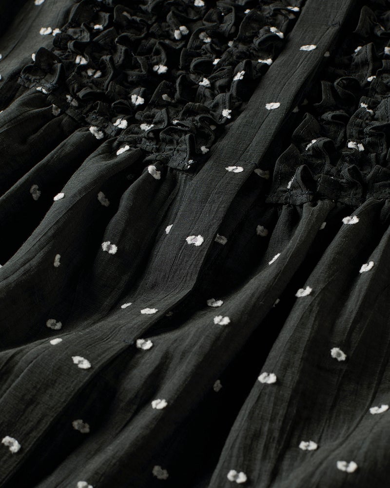 ドット(水玉)やフリルなど、愛らしいディテール満載なのに子どもっぽくならないのは、水玉が実は手の込んだジャカードだったり、色をモノトーンに絞っていたり、素材感やシルエットのひとつひとつが計算されているから。大人仕様の甘さを堪能できるブラウスです。