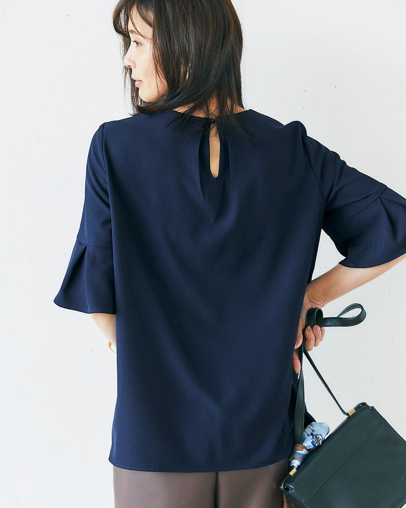 - 二の腕カバー&ほっそり華奢見え、ベルスリーブブラウスベースはシンプルに着回しやすく、袖に華やかさをプラスしたTブラウス。袖口にタックを効かせたふんわりベルスリーブが、二の腕をほっそり華奢に見せてくれます。