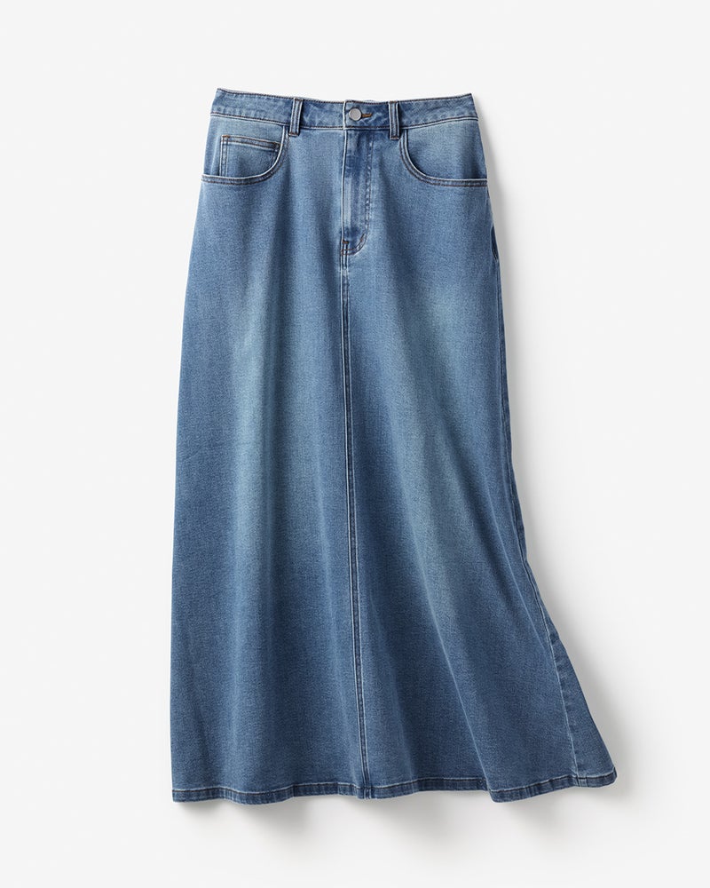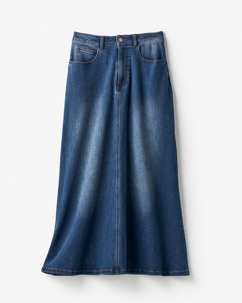 9.5オンスのライトストレッチデニムで仕立てたロングスカートは、軽く伸びやかでストレスフリーな着心地。ヒップ周りはすっきりフィットし、裾に向けて緩やかに広がるAラインで足さばきもスムーズです。身長やお好みで選べる着丈73cmと、着丈88cmの2丈をご用意しました。