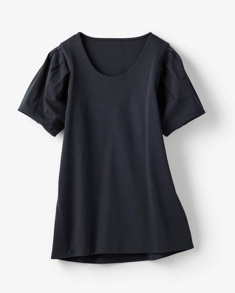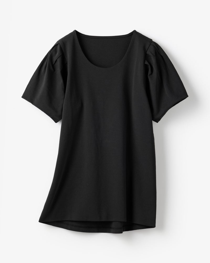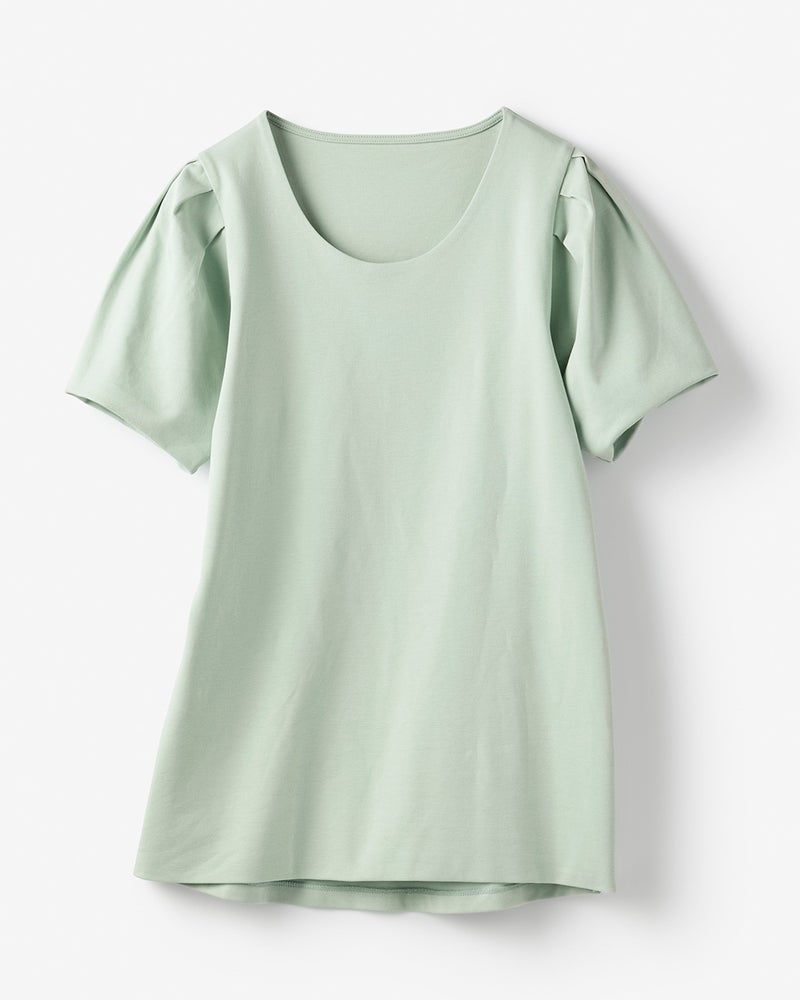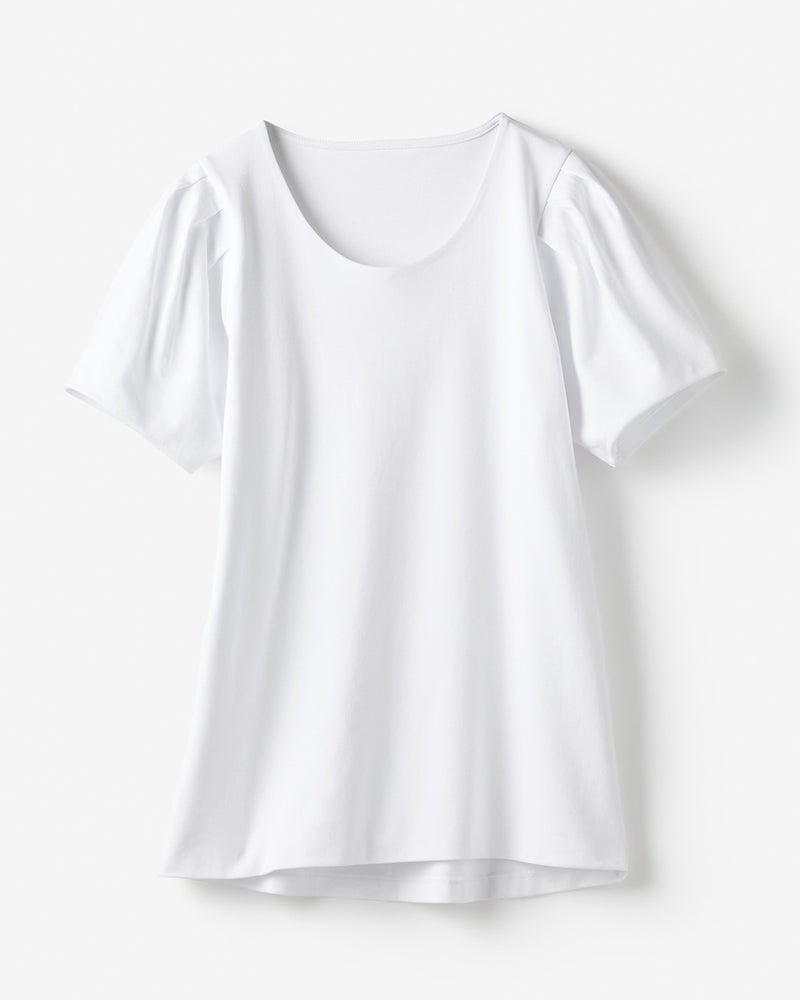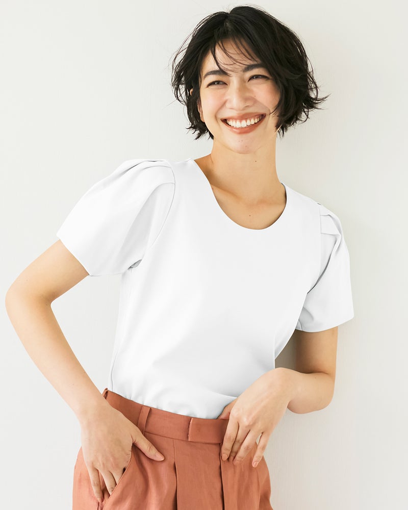 肩にタックを寄せてふんわり仕立てた、つぼみみたいな半袖パフスリーブ。シンプルな装いでも、可愛らしい袖デザインで品よく華やかに。