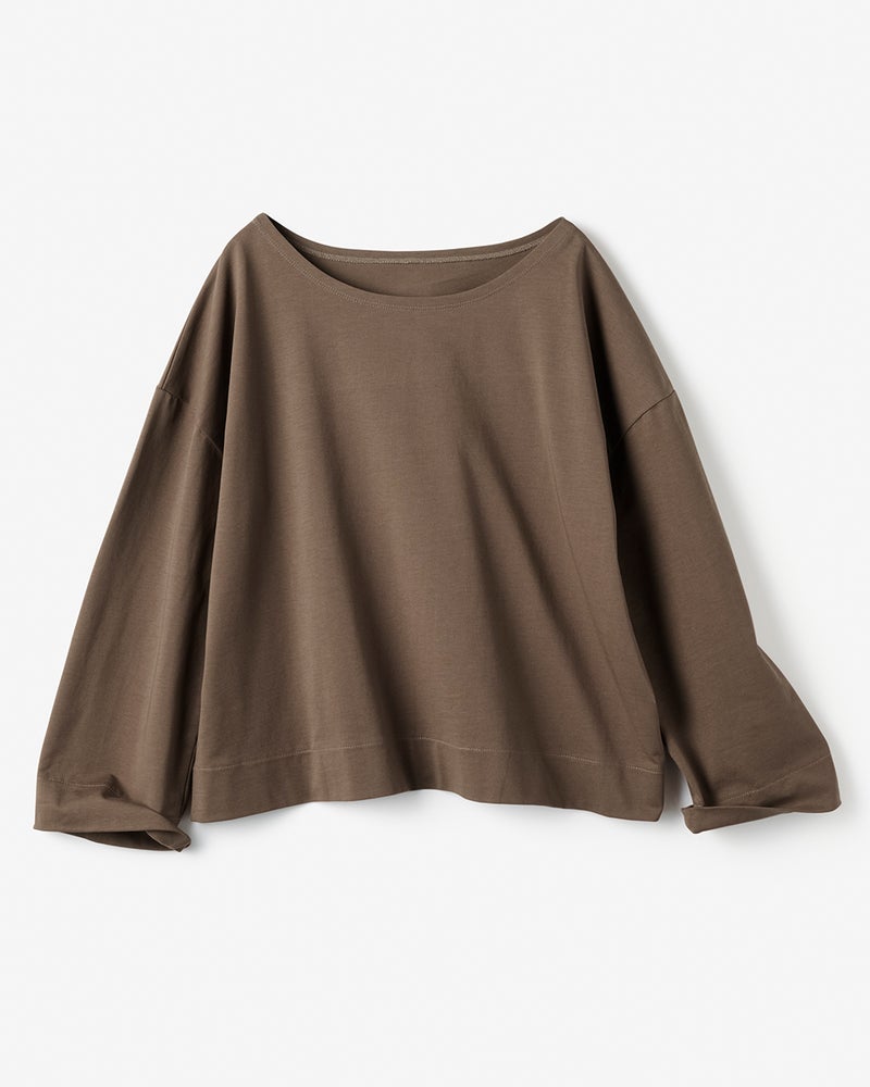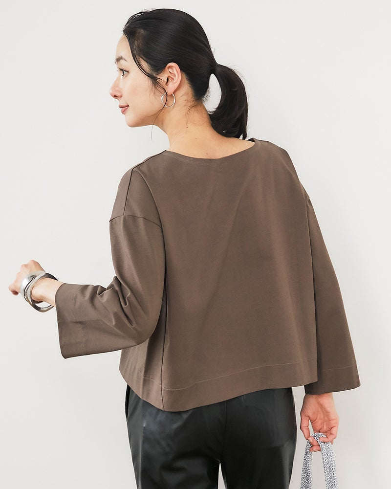 前は詰まり気味のネック、後ろは深めのネックと前後どちらでも着られる2WAYデザイン。ややワイドな身頃で今っぽい着こなしを叶えます。