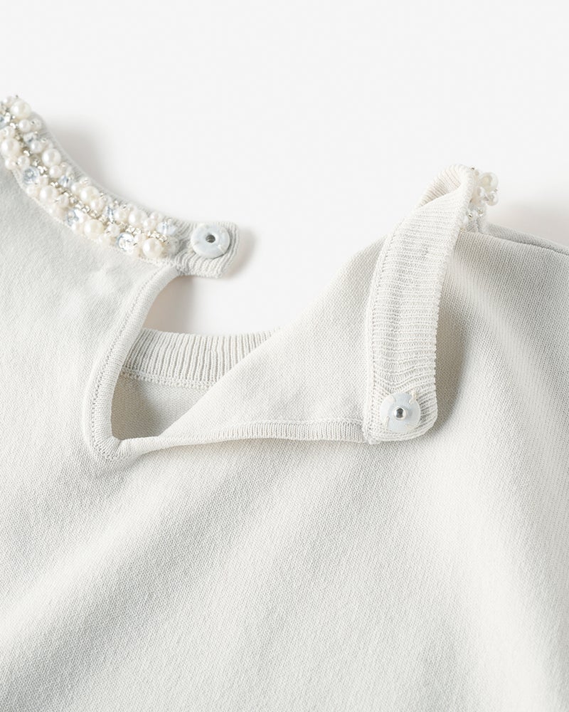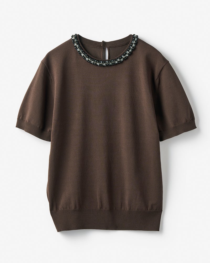 1枚で、アクセサリーなしでも華やいだ印象をつくれるニット。柔らかなサマーニットのネックラインに、ビーズやパール、スパンコールをたっぷりと配したチュールテープを縫い付けています。コンパクトなサイズ感で、合わせるボトムスを選びません。