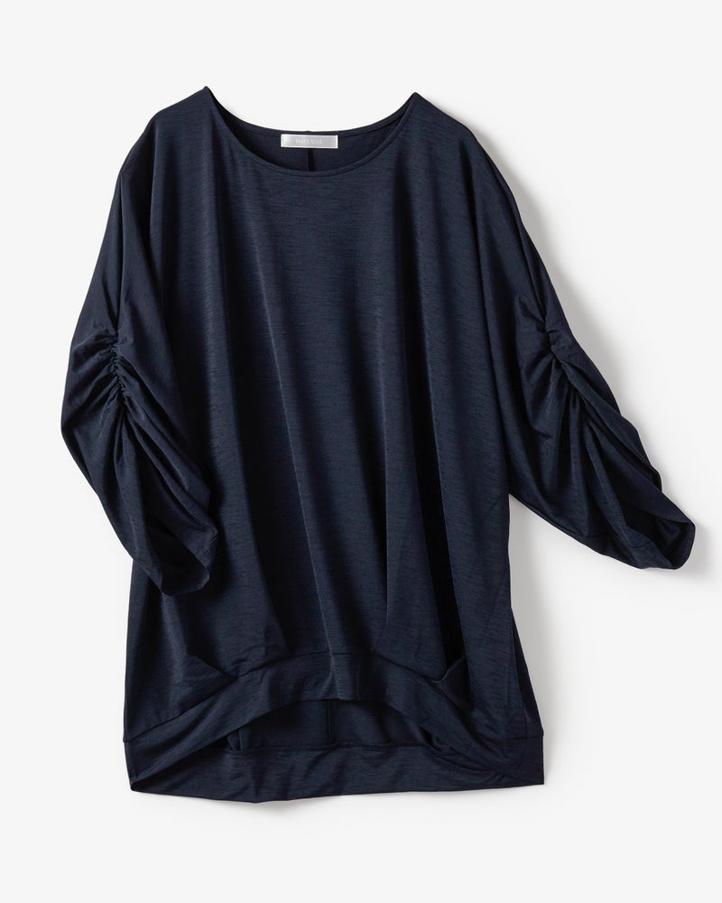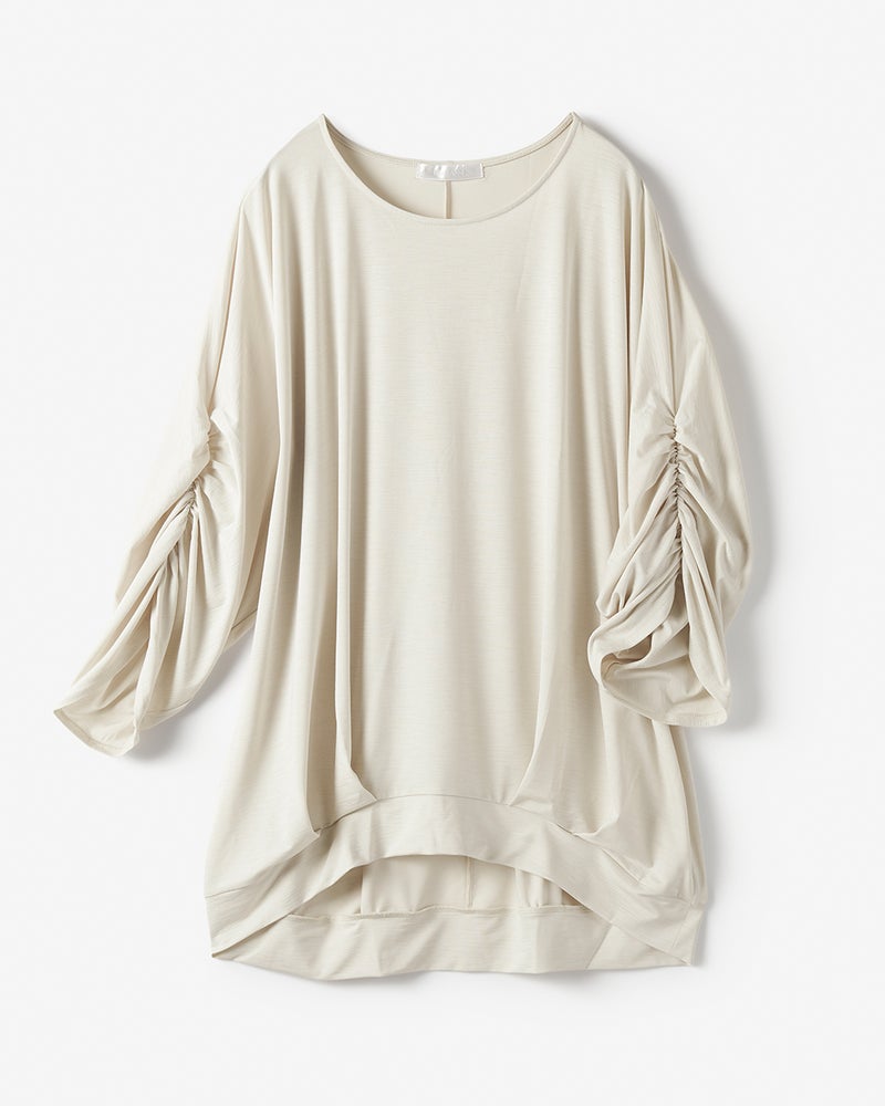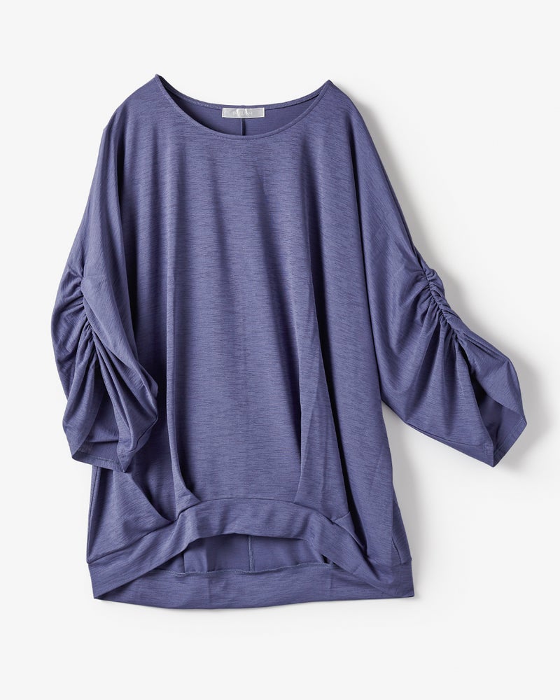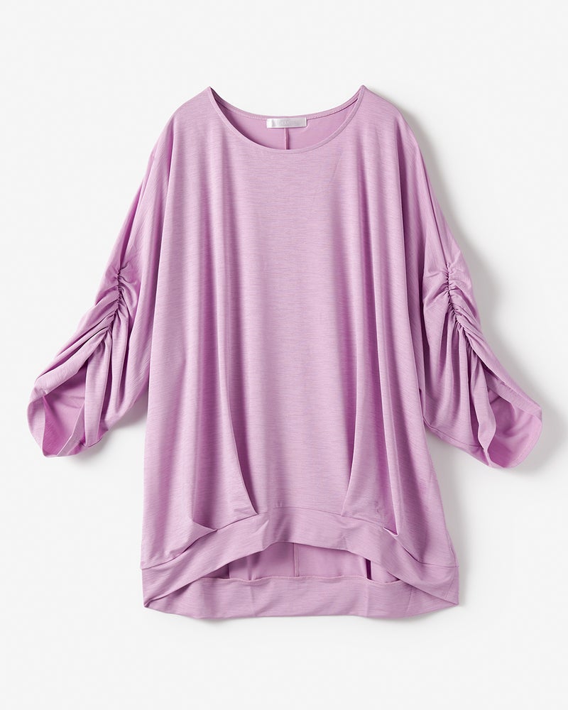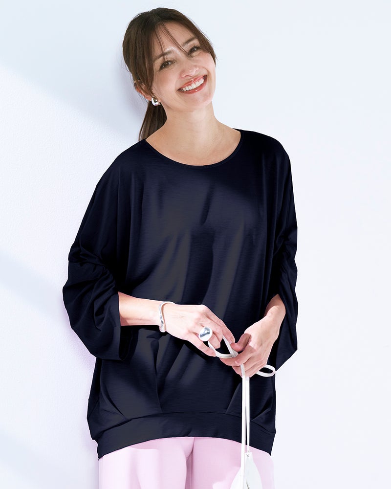 紫外線を90%カットする機能派カットソー、UVスラブのドルマンプルオーバー。袖のギャザーや裾のタックが立体的なドレープを作り出し、1枚で着こなしが完成するデザイン性が魅力です。少し長めの丈感で体型カバーも楽々。洗ってもすぐ乾き、しわになりにくいのも魅力です。