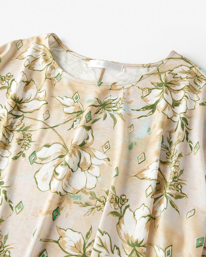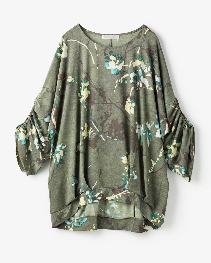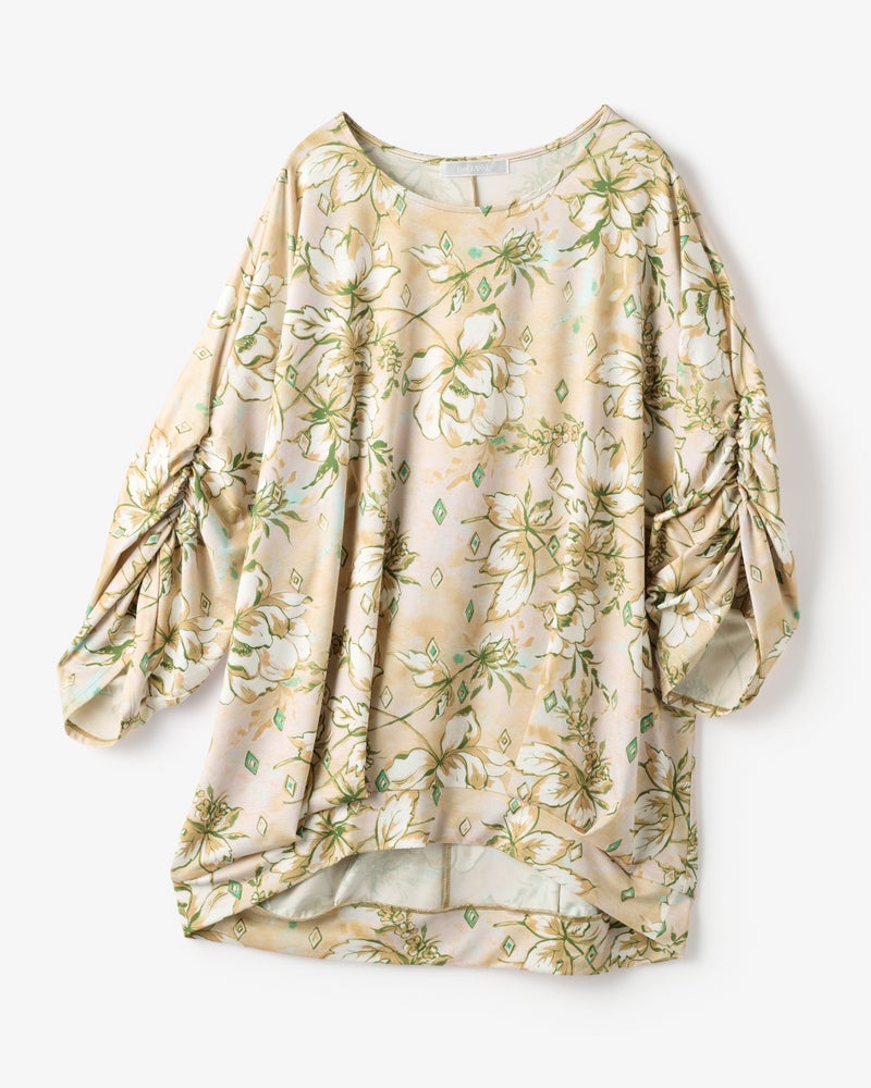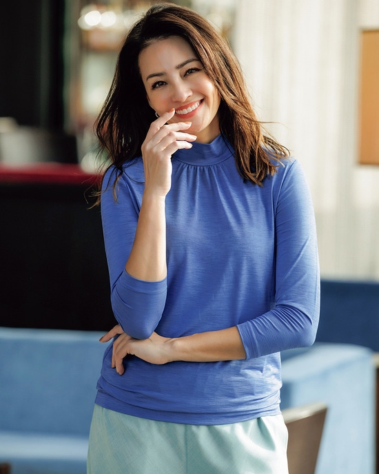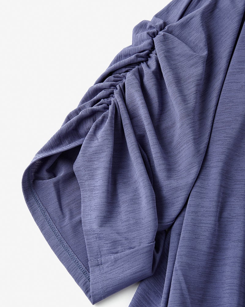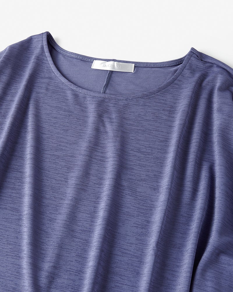紫外線を90%カットする機能派カットソー、UVスラブのドルマンプルオーバー。袖のギャザーや裾のタックが立体的なドレープを作り出し、1枚で着こなしが完成するデザイン性が魅力です。少し長めの丈感で体型カバーも楽々。洗ってもすぐ乾き、しわになりにくいのも魅力です。