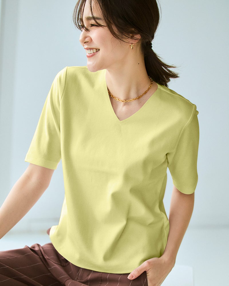 - シルエットを一新して、ドゥクラッセTシャツがリニューアル!ぴたぴたせず今っぽく着られるゆったり身頃や華奢な肩を演出する新デザインで、1枚でも重ね着でも決まる1着に。露出を控えながらクールに着こなせるVネックは大人の女性に人気のデザイン。ジャケットインにも似合います。