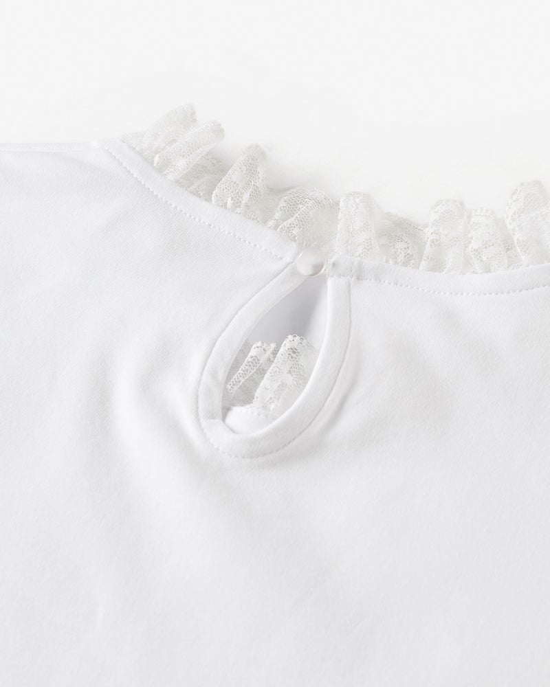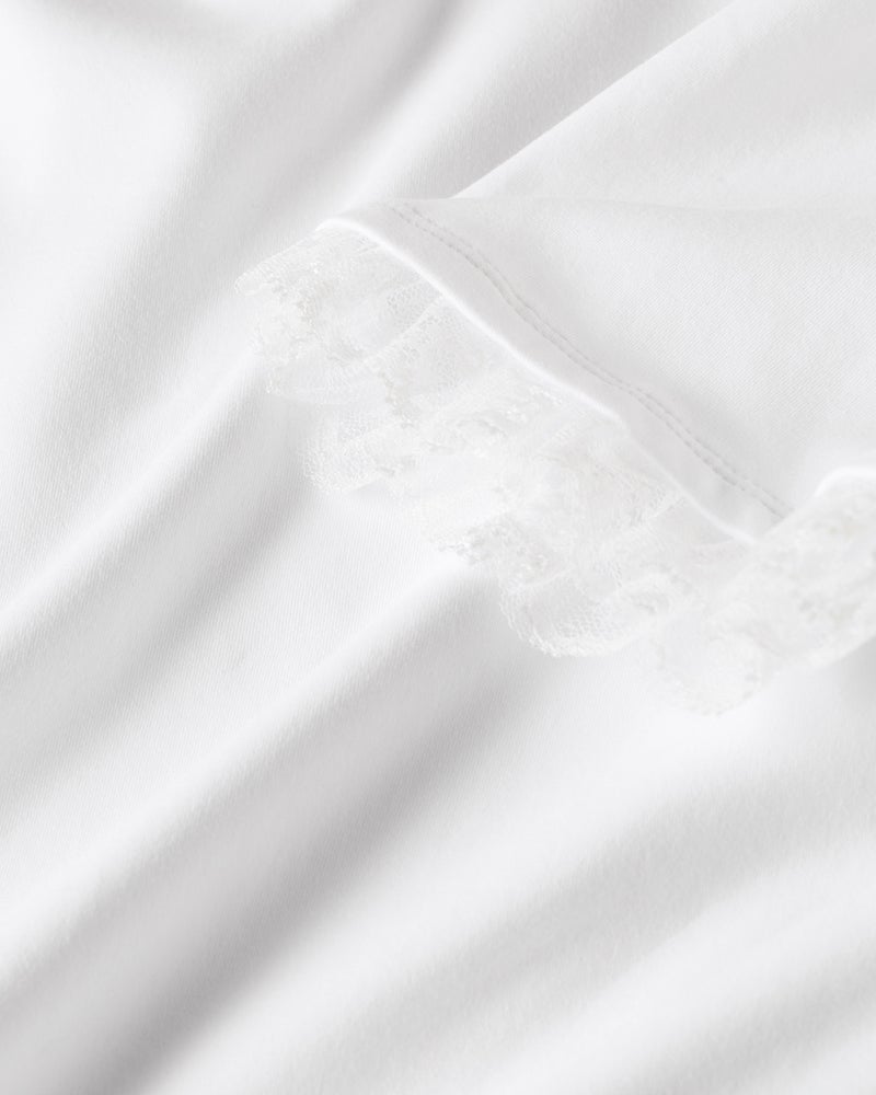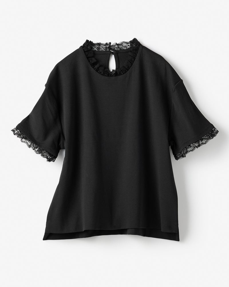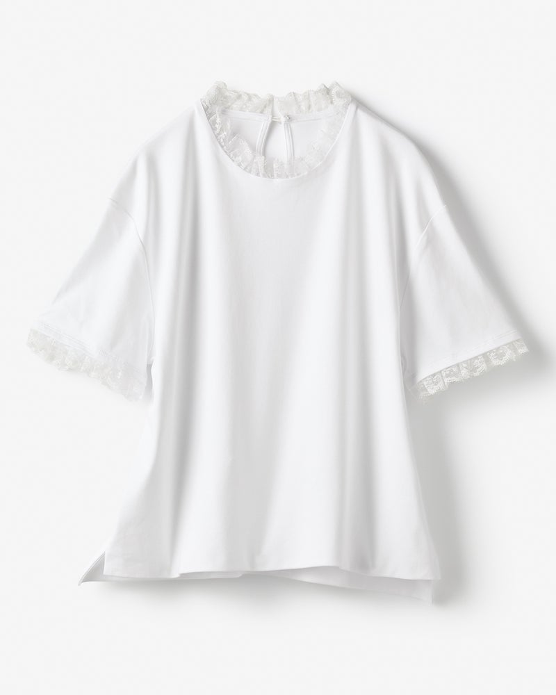 すっきり仕立てたクルーネック半袖に、ネック&袖口に繊細レースをあしらったブラウス見えデザイン。透けない機能性と着映えデザインで、大人の夏にぴったりの1着に。
