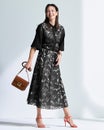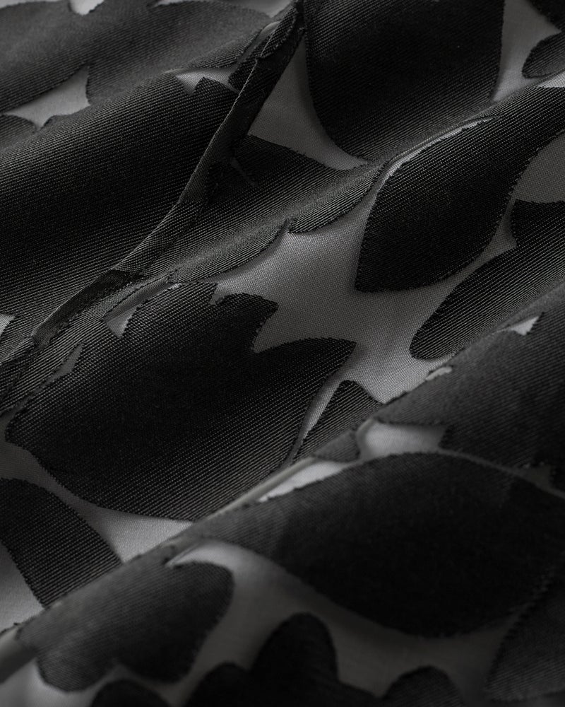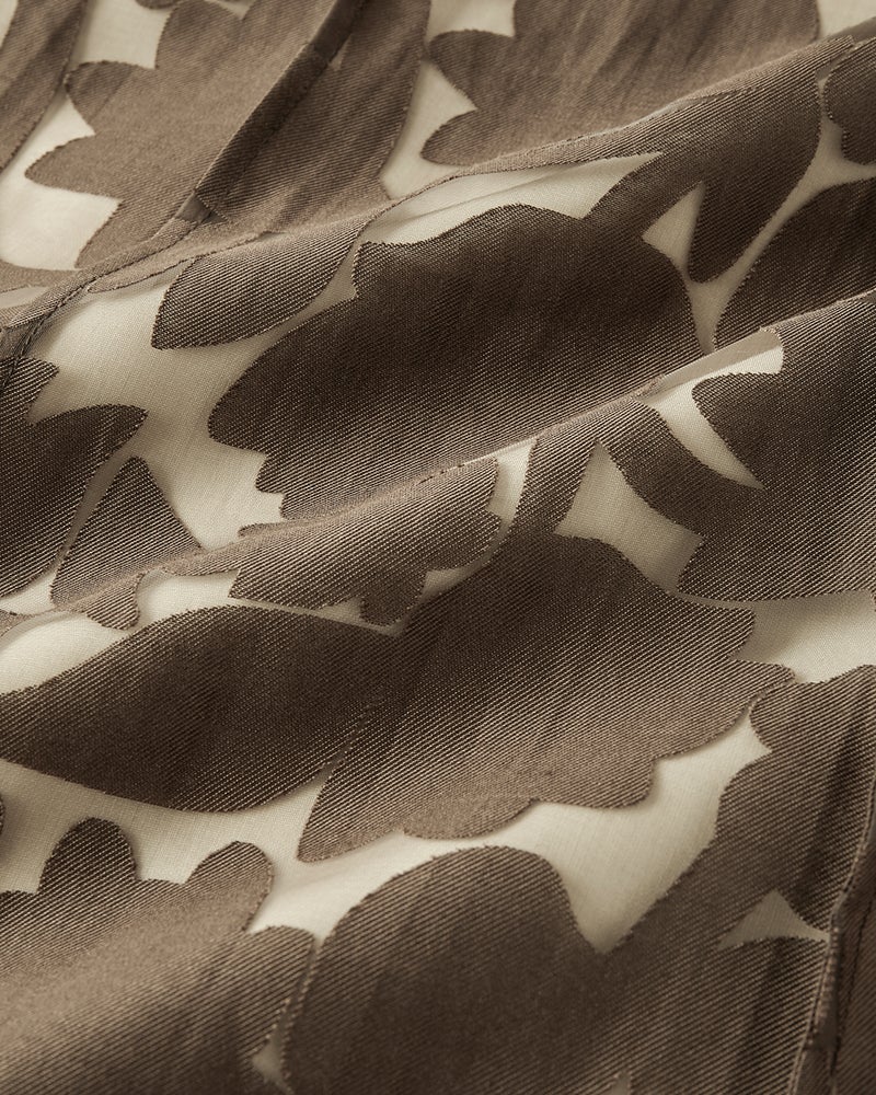 シアーな部分と模様の部分のコントラストで、立体フラワーを浮き上がらせた「シアーオパール」素材。春の光を透かす透明感が、大人の肌を引き立てます。