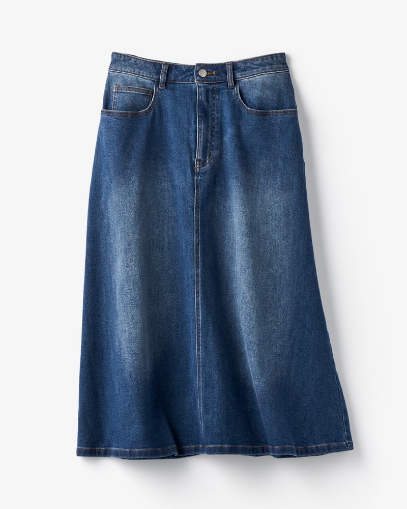 9.5オンスのライトストレッチデニムで仕立てたロングスカートは、軽く伸びやかでストレスフリーな着心地。ヒップ周りはすっきりフィットし、裾に向けて緩やかに広がるAラインで足さばきもスムーズです。身長やお好みで選べる着丈73㎝と、着丈88cmの2丈をご用意しました。